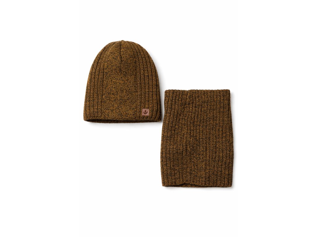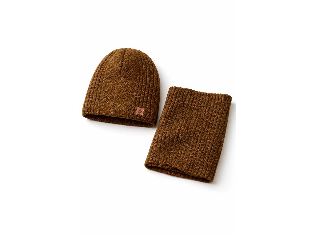 Hnedý melírovaný dizajn pôsobí moderne a ľahko sa kombinuje so zimnou bundou či kabátom. Komplet je vhodný na bežné nosenie, do školy, na prechádzky aj zimné aktivity.