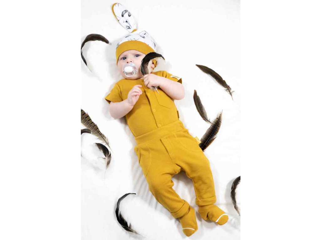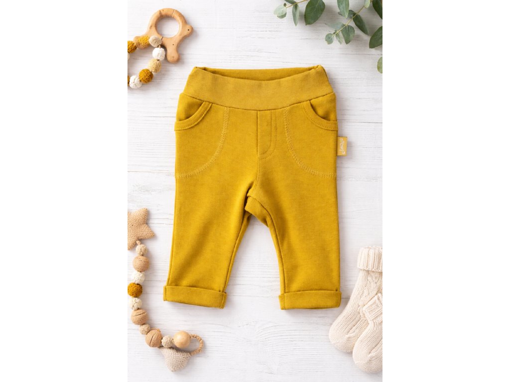 Módne nohavice z horčicovej bavlny, vyrobené zo 100% bavlny, ktorá je úplne bezpečná pre detskú pokožku.
