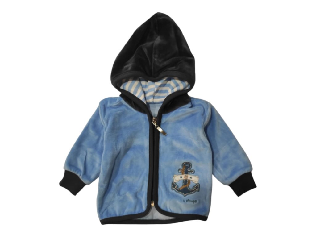 Mikina má zapínanie na zips, vďaka čomu sa ľahko oblieka aj vyzlieka. Kapucňa chráni hlavičku dieťaťa pred chladom a dodáva kompletu športovo-elegantný vzhľad. Jemná nášivka na mikine pôsobí hravo a štýlovo.