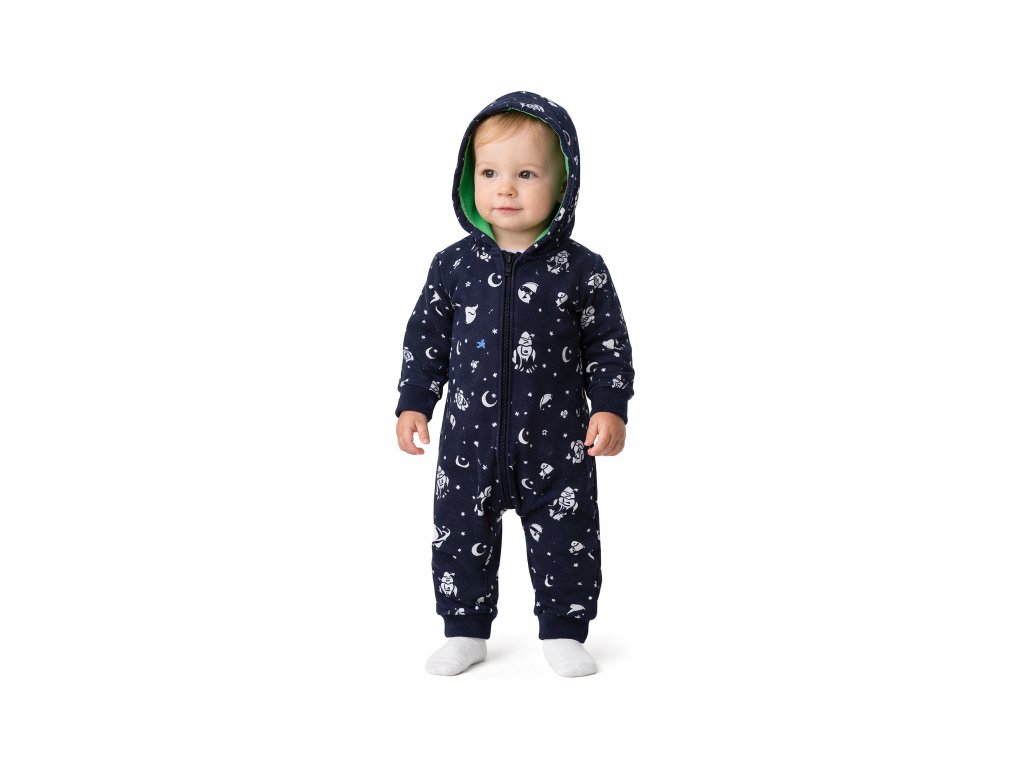 Overal má praktické zapínanie po celej dĺžke, ktoré výrazne uľahčuje obliekanie aj prebaľovanie. Kapucňa s kontrastnou zelenou podšívkou chráni hlavičku dieťaťa a zároveň dodáva moderný vzhľad. Hravý vesmírny motív s raketami, planétami a hviezdičkami si zamilujú deti aj rodičia.