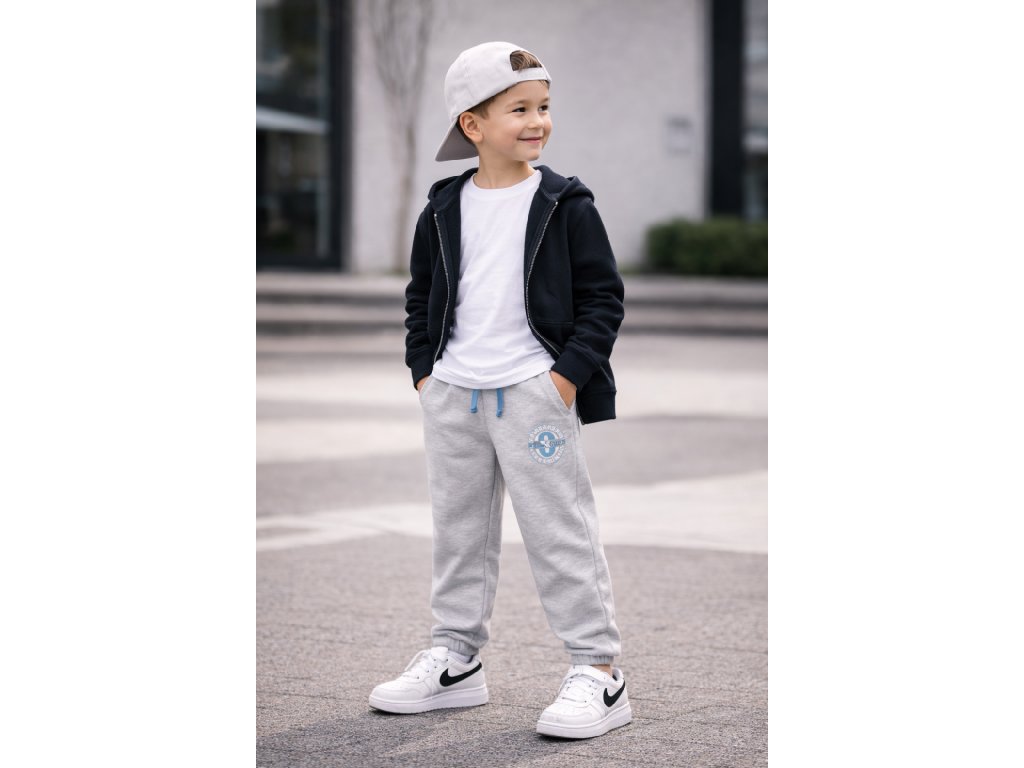 Chlapčenské sivé tepláky s modrou šnúrkou sú ideálnou voľbou pre deti, ktoré majú rady pohodlné a moderné oblečenie. Jednoduchý športový dizajn dopĺňa štýlová potlač na nohavici a kontrastná modrá šnúrka v páse, ktorá dodáva teplákom moderný vzhľad.