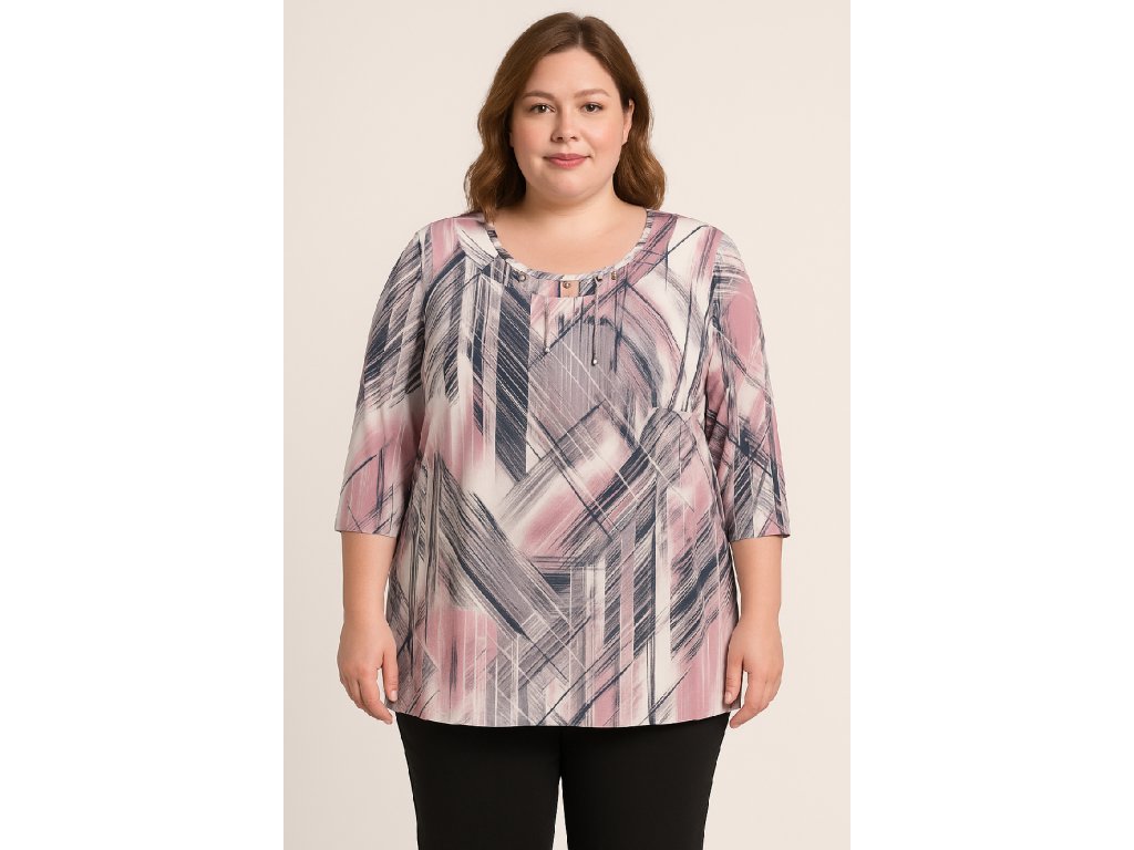 Hľadáte elegantný a zároveň pohodlný kúsok do vášho šatníka? Táto dámska tunika s 3/4 rukávmi je ideálnou voľbou pre ženy, ktoré chcú vyniknúť. Zaujme jemným abstraktným vzorom v odtieňoch lilej, sivej a čiernej a lichotivým strihom, ktorý krásne padne na postavu. Výstrih zdobia dekoratívne gombíky a jemné šnúrky, ktoré dodávajú tunike štýlový nádych.