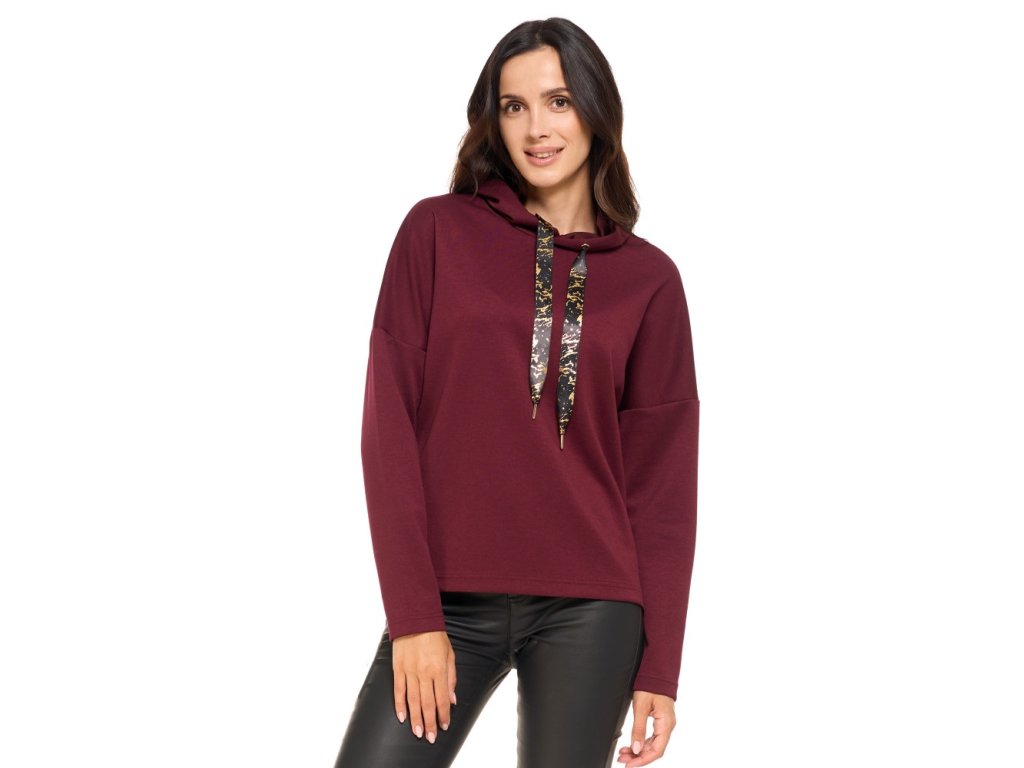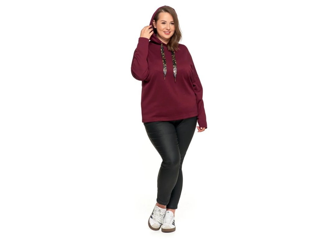 Bordová farba patrí medzi najobľúbenejšie jesenné a zimné odtiene – pôsobí elegantne, žensky a veľmi ľahko sa kombinuje s džínsami, legínami či koženkovými nohavicami. Mikina má moderný voľnejší strih a atraktívne ozdobné šnúrky, ktoré jej dodávajú jedinečný vzhľad.