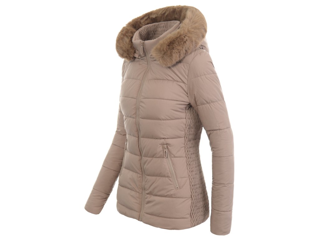 Krásna, veľmi módna dámska zimná, prešívaná ecru bunda. Bunda sa zapína na zips. Zateplené kvalitnou syntetickou výplňou, ktorá zaisťuje tepelnú izoláciu a vysoký komfort používania. Má dve priestranné vrecká na zips. Látková manžeta na rukáve. Bunda má odopínateľnú kapucňu s odopínateľnou kožušinkou, ktorá je ako stvorená na ochranu pred vetrom a dažďom. Bunda je ideálnym riešením pre ľudí, ktorí si cenia pohodlie a hodia sa k mnohým štýlom.