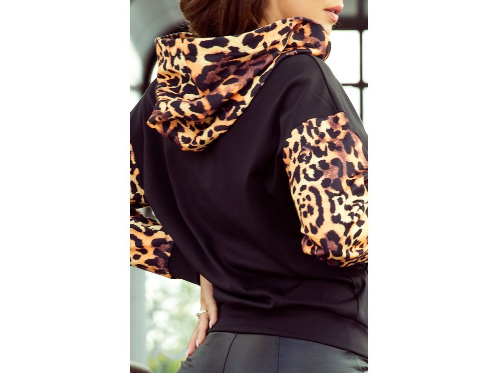 Štýlová dámska mikina s kapucňou je výrazným kúskom pre moderný mestský outfit. Kombinácia čiernej farby s leopardím vzorom na rukávoch a kapucni dodáva mikine originálny vzhľad. Praktické klokanie vrecko, pohodlný strih,zaručia komfort pri každodennom nosení. Ideálna na voľný čas, do mesta aj na neformálne stretnutia – výrazný kúsok pre ženy, ktoré chcú vyniknúť.