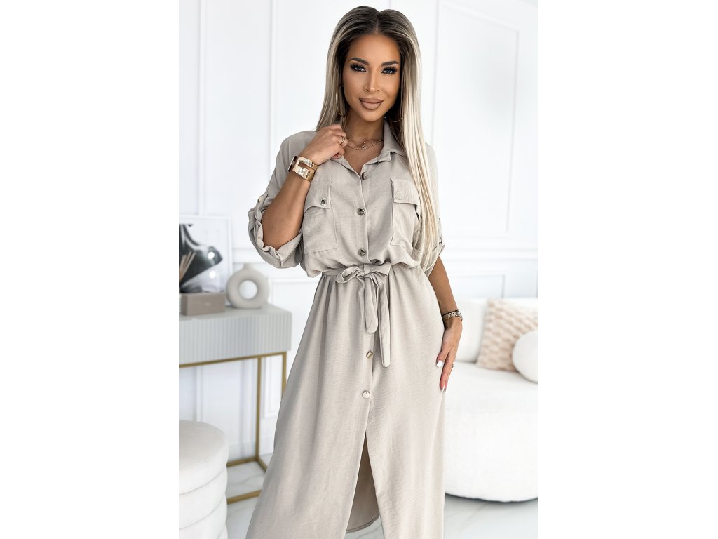 Dámske béžové košeľové šaty s opaskom, veľkosť UNI