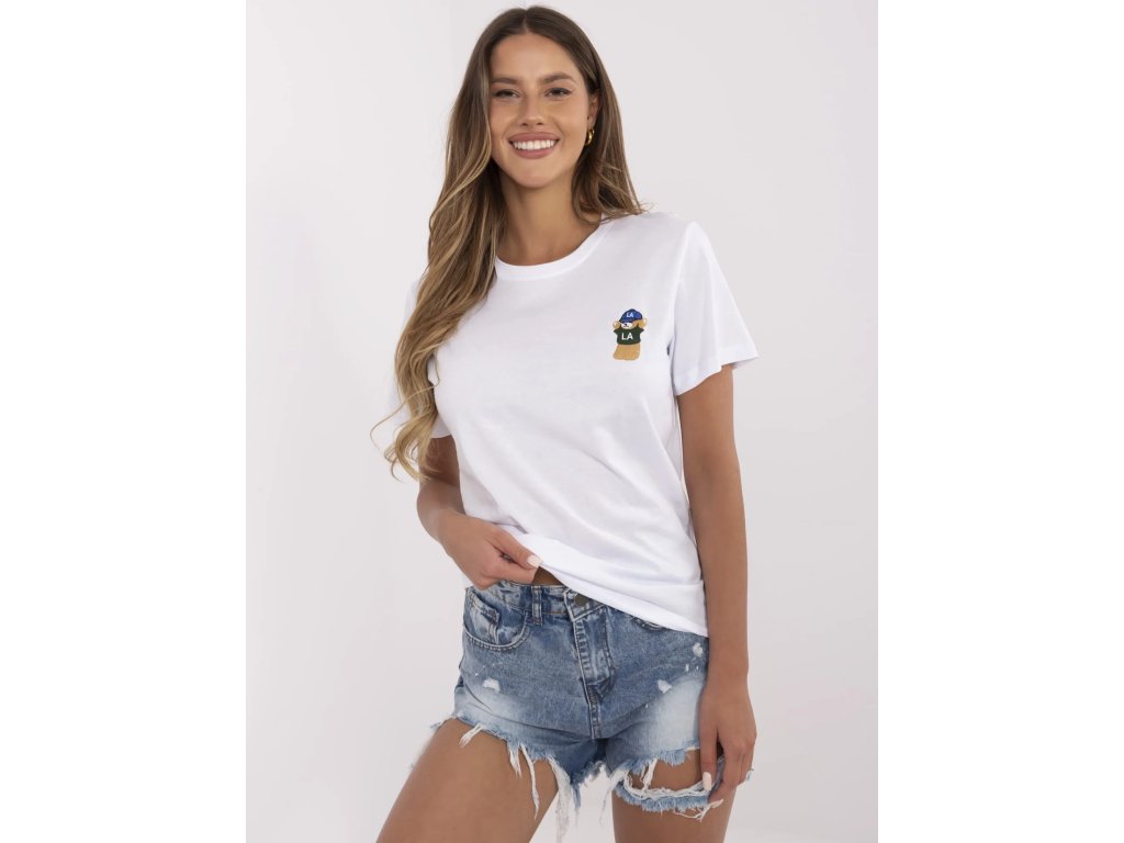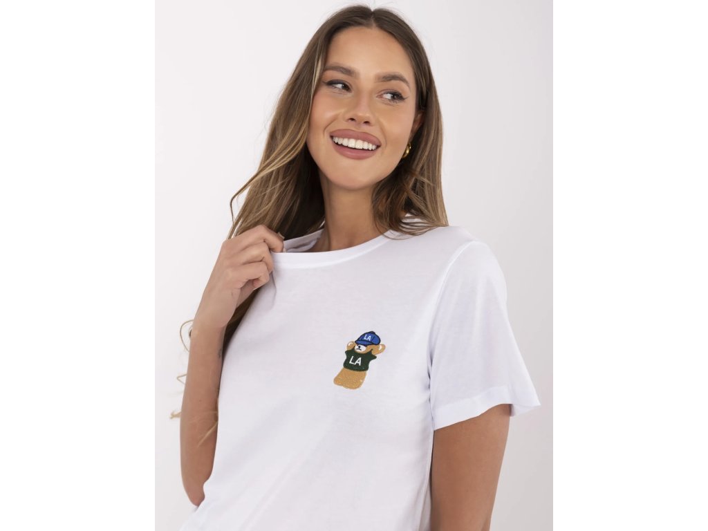 Štýlové dámske biele tričko s originálnou potlačou medvedíka LA je ideálnym kúskom pre ležérny, mladistvý vzhľad. Kvalitný bavlnený materiál zaručuje príjemné nosenie a pohodlie počas celého dňa. Klasický strih s okrúhlym výstrihom a krátkymi rukávmi umožňuje ľahkú kombináciu s rifľami, kraťasmi alebo sukňou. Potlač medvedíka v športovom štýle dodá outfitu hravý a moderný nádych, či už ho zvolíte na bežný deň, do mesta alebo na voľný čas.