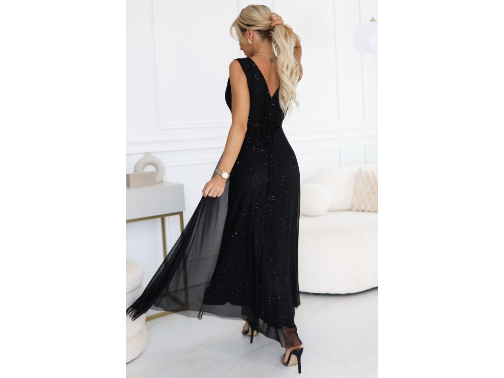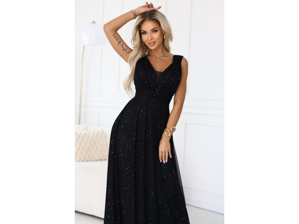 Dámske čierne večerné maxi šaty s brokátovým efektom