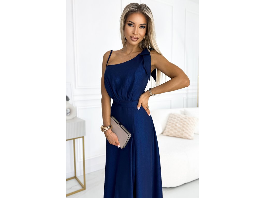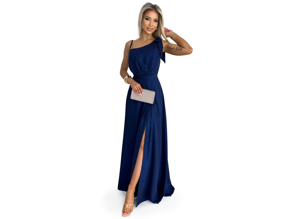 Dámske dlhé spoločenské šaty na jedno rameno s rázporkom – jemne trblietavé