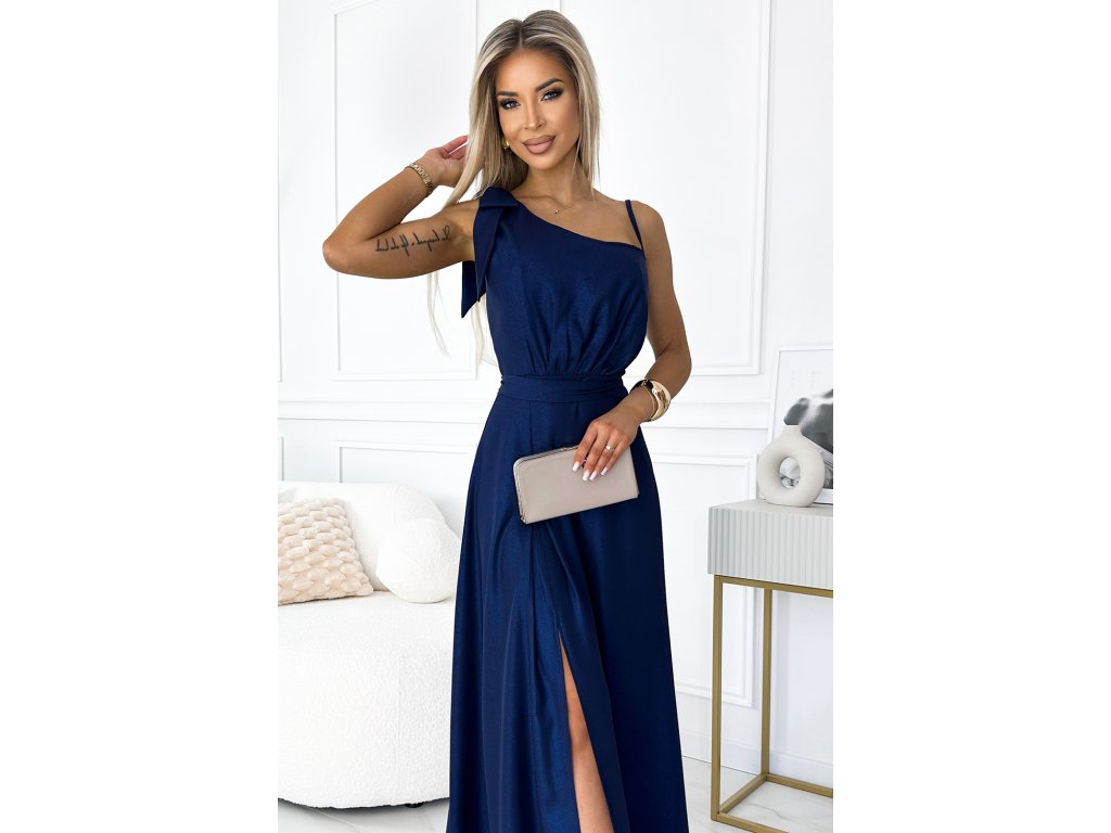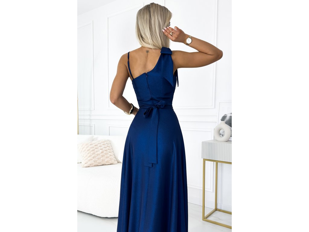 Tieto dámske dlhé spoločenské šaty na jedno rameno sú dokonalou kombináciou elegancie a štýlu. Originálne riešenie ramienka s ozdobnou mašľou dodáva šatám jedinečný charakter, zatiaľ čo jemne trblietavý materiál pôsobí luxusne a atraktívne.