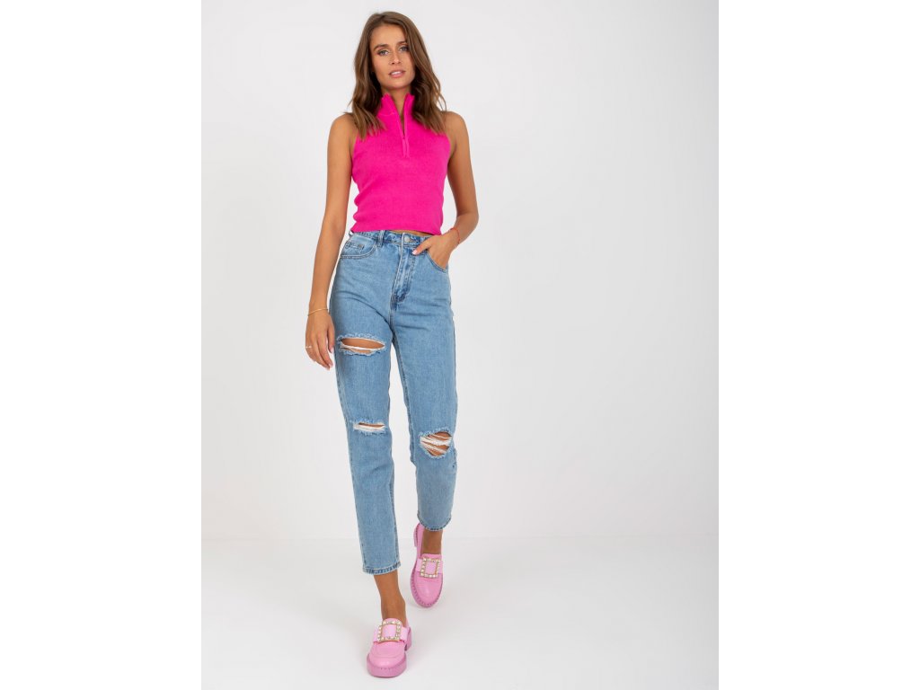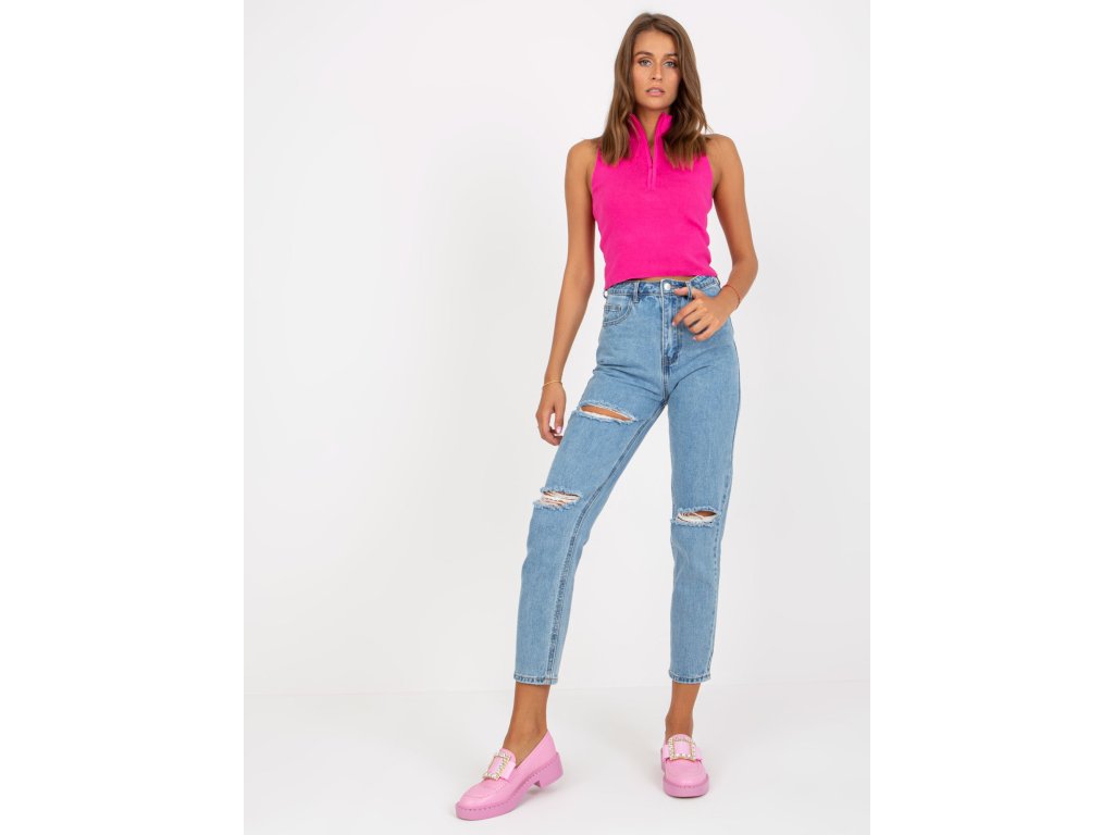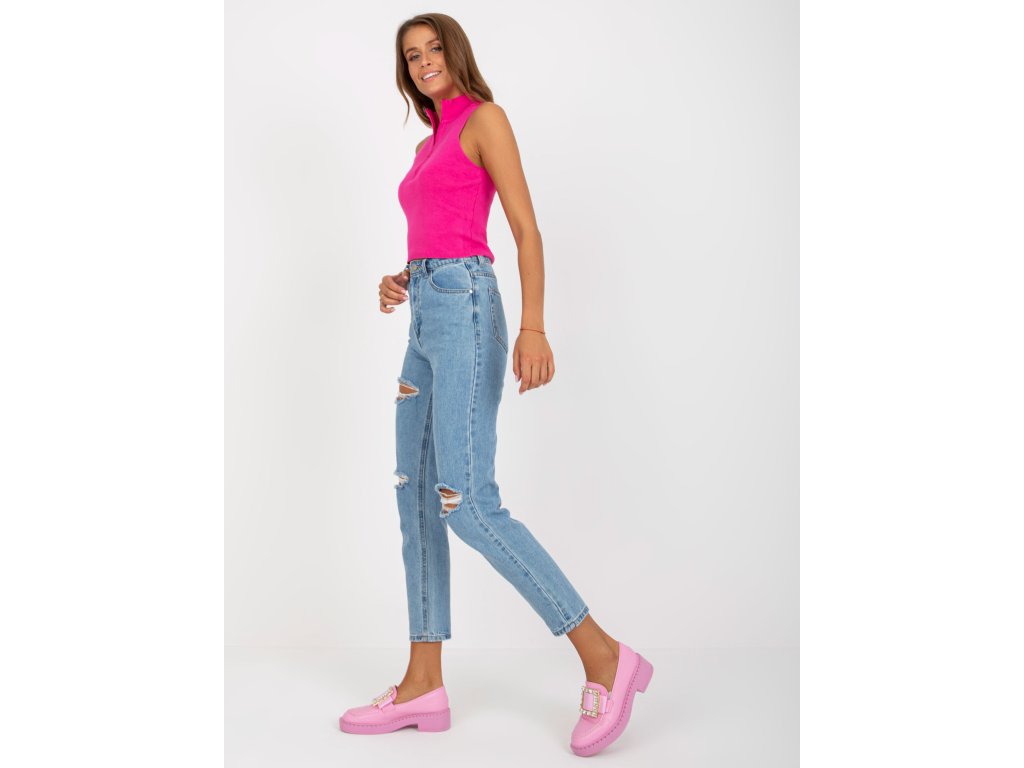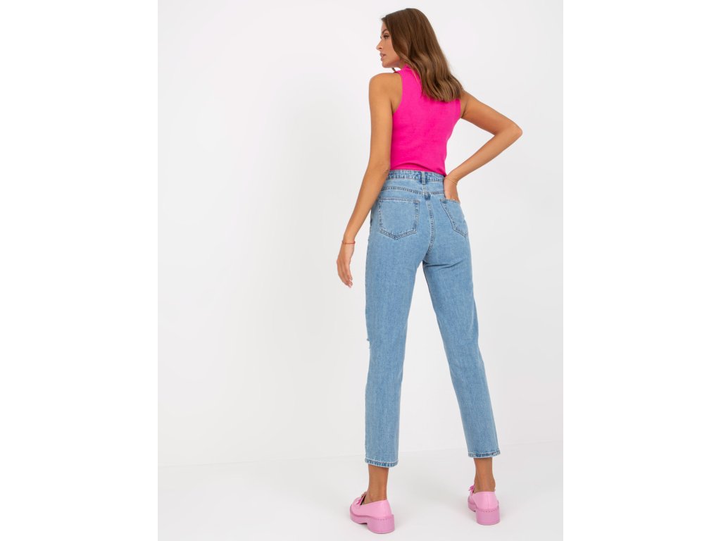 Modré dámske mom džínsy s dierami.