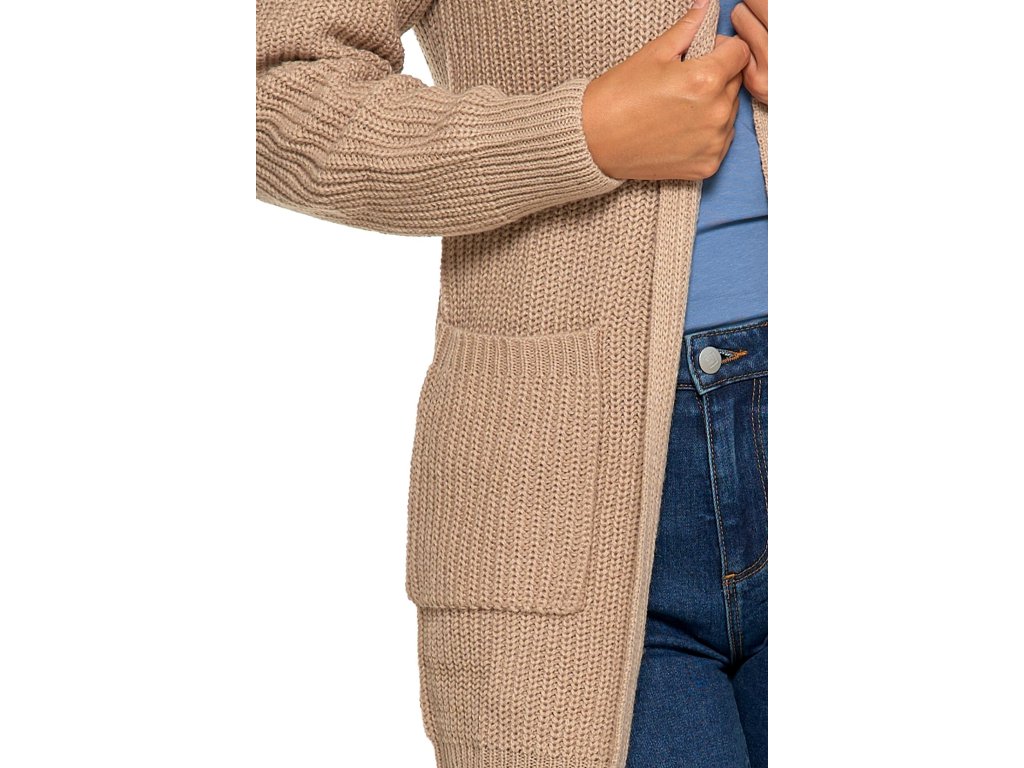 Dámsky kardigán je ideálnou voľbou na chladnejšie dni. Vyrobené z mäkkého, úpletu s klasickým vzorom, spája nadčasový štýl s komfortom nosenia. Voľný strih a dĺžka bokov robí kardigan pohodlným , pričom zvýrazňuje postavu. Dlhé rukávy zakončené manžetou dokonale priliehajú k zápästiu, čím dodávajú praktickosť a estetiku. Dve všité funkčné vrecká sú nielen štýlovým akcentom, ale aj praktickým riešením, perfektným na odkladanie drobností alebo zahriatie rúk v chladnejších dňoch. Kardigan sa bude skvele hodiť k vašim obľúbeným džínsom, legínam alebo šatám a vytvorí tak univerzálny štýl na každú príležitosť. Vďaka pletenej väzbe má jedinečný dizajn, ktorý zdôrazňuje jej elegantný charakter a vynikajúce spracovanie. Je to nevyhnutná súčasť oblečenia každej ženy, ktorá oceňuje štýl, funkčnosť a nadčasovú eleganciu.