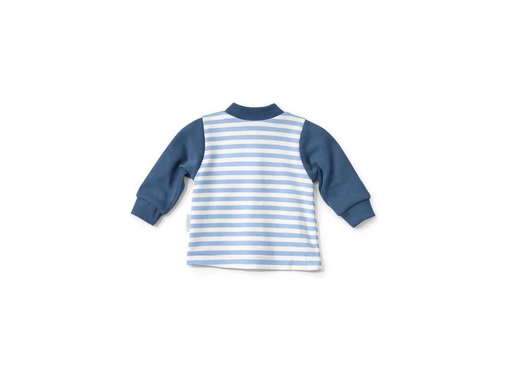 Košieľka má praktické zapínanie vpredu na patentky, vďaka čomu sa ľahko oblieka aj vyzlieka. Modro-biely pruhovaný vzor v kombinácii s tmavomodrými rukávmi a lemovaním pôsobí nadčasovo a moderne. Na prednej strane sa nachádza jemná aplikácia kotvy, ktorá dodáva košieľke námornícky a hravý vzhľad.
