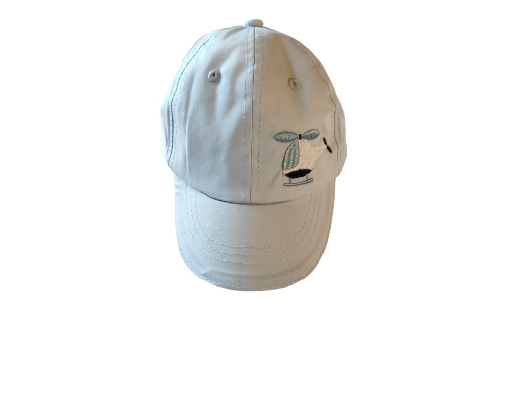 Detská šiltovka pre chlapcov bledomodrej farby ,s vyšitou aplikáciou vrtuľníka.