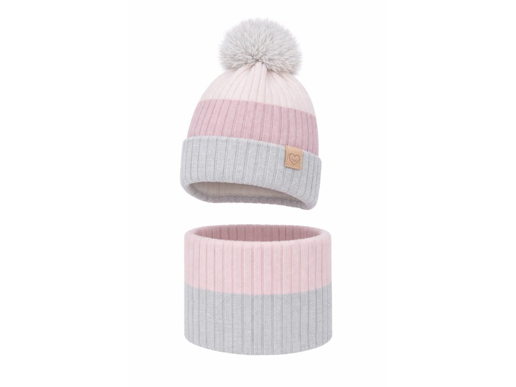 Detský zimný komplet sivo ružová čiapka s brmbolcom a nákrčník Indiana