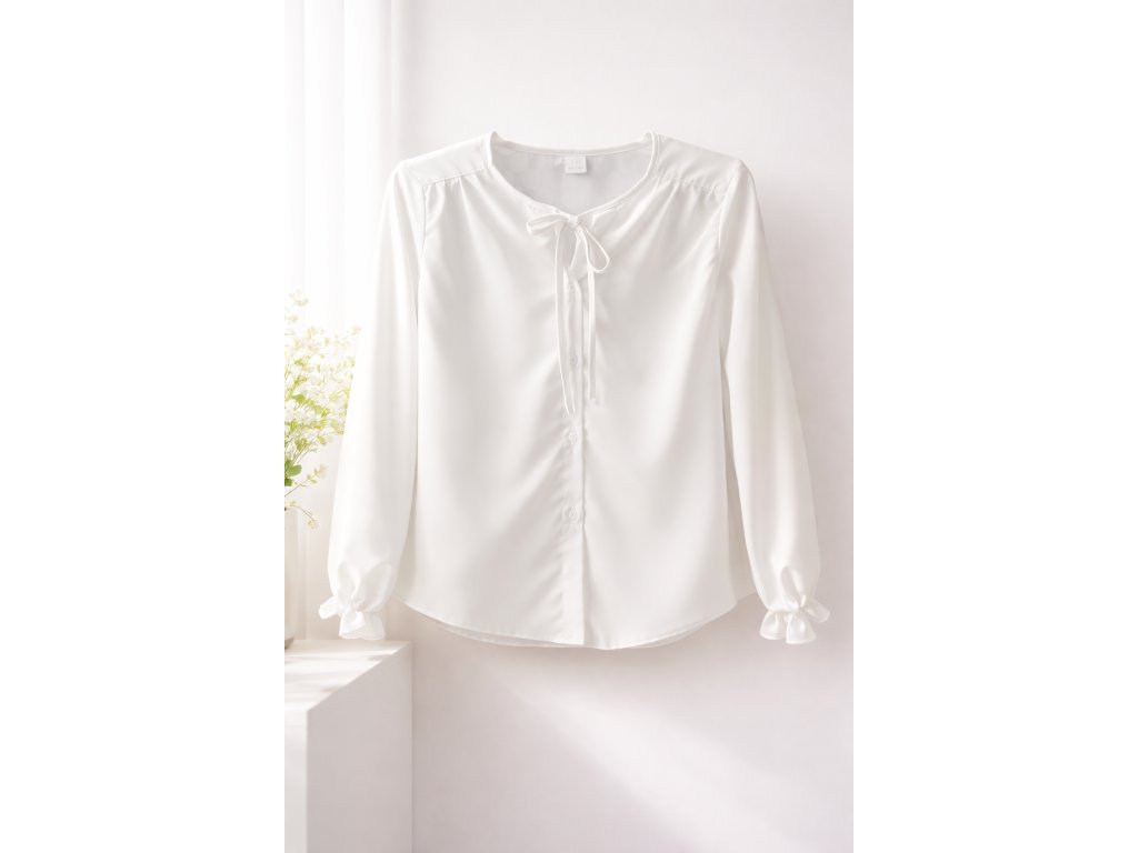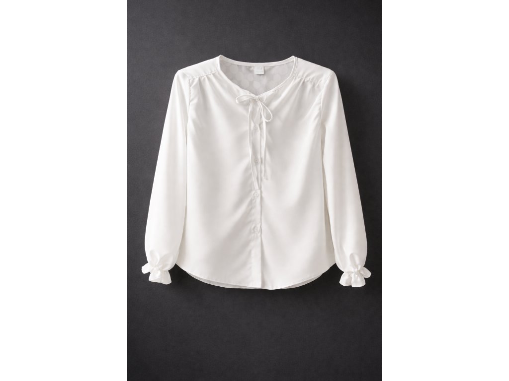 Blúzka má okrúhly výstrih s viazaním, ktoré vytvára jemný otvor pri krku – nepôsobí upnuto a zároveň zachováva elegantný vzhľad. Zapínanie na gombíky nezasahuje až ku krku, čo zvyšuje komfort pri nosení. Rukávy sú zakončené jemnou gumičkou bez mašlí, presne tak, aby blúzka pôsobila čisto a nadčasovo.