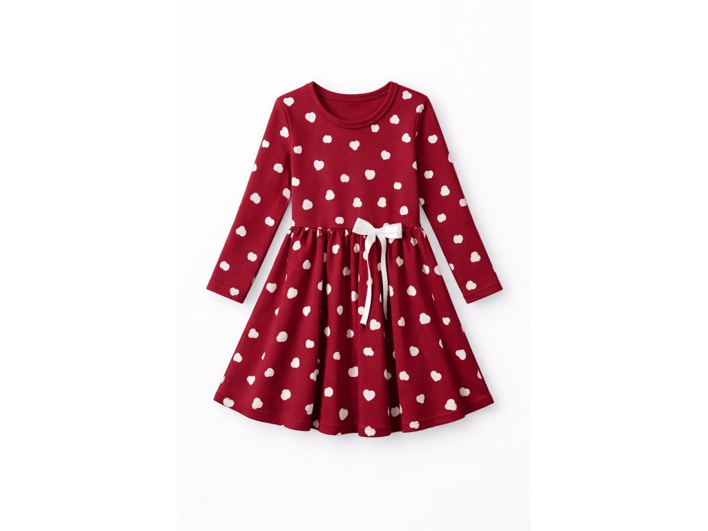 Dievčenské bordové šaty s bielymi srdiečkami vo veľkosti 110. Pohodlný strih, dlhý rukáv a jemná mašlička v páse. Ideálne na oslavy, sviatky aj bežné nosenie.