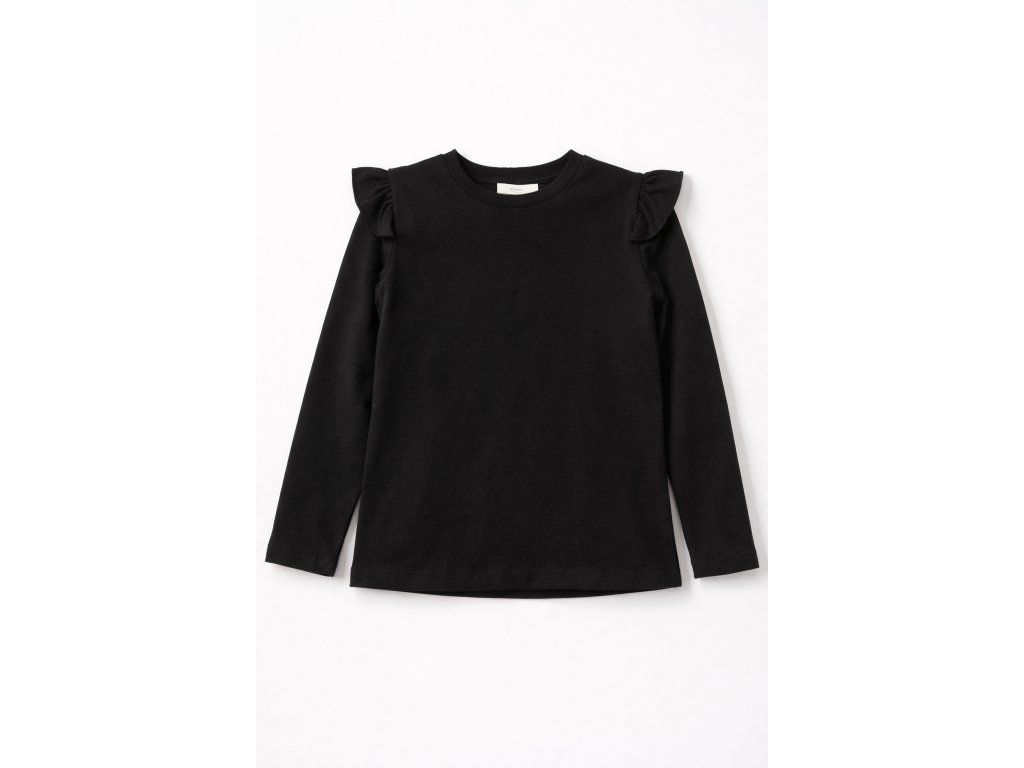 Toto dievčenské tričko s dlhým rukávom v sýto čiernej farbe je nadčasový kúsok, ktorý by nemal chýbať v šatníku žiadnej malej parádnice. Minimalistický dizajn je doplnený o jemné volániky na ramenách, ktoré dodávajú tričku elegantný a dievčenský vzhľad.