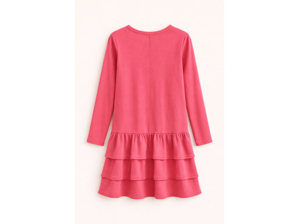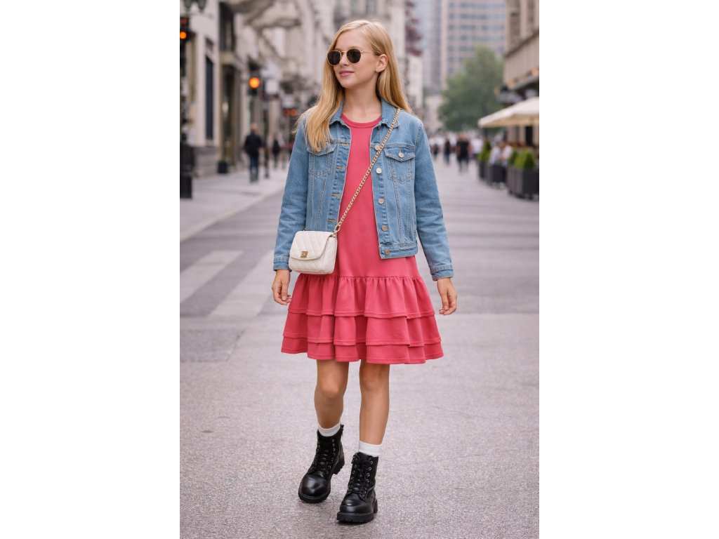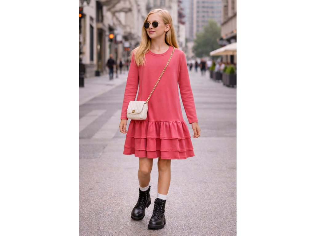 Tieto dievčenské šaty s volánmi sú ideálnou voľbou pre dievčatá, ktoré chcú vyzerať štýlovo a cítiť sa pohodlne zároveň. Jednoduchý vrchný diel s okrúhlym výstrihom dopĺňa trojvrstvová volánová sukňa, ktorá dodáva šatám hravý a moderný vzhľad.