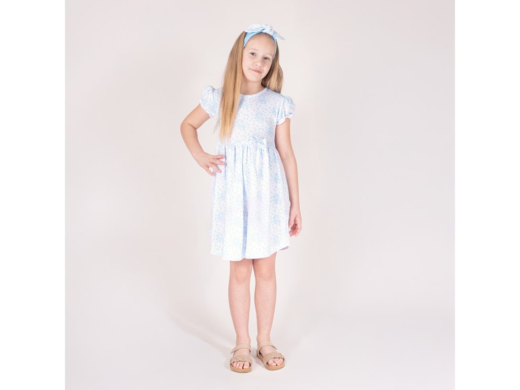 Roztomilé dievčenské letné šaty v bielej farbe s jemným modrým kvetinovým vzorom. Krátke nariasené rukáviky, mašlička v páse a pohodlný strih robia z týchto šiat ideálny kúsok na bežné nosenie aj oslavy.