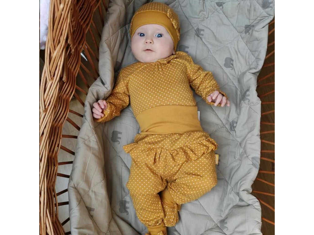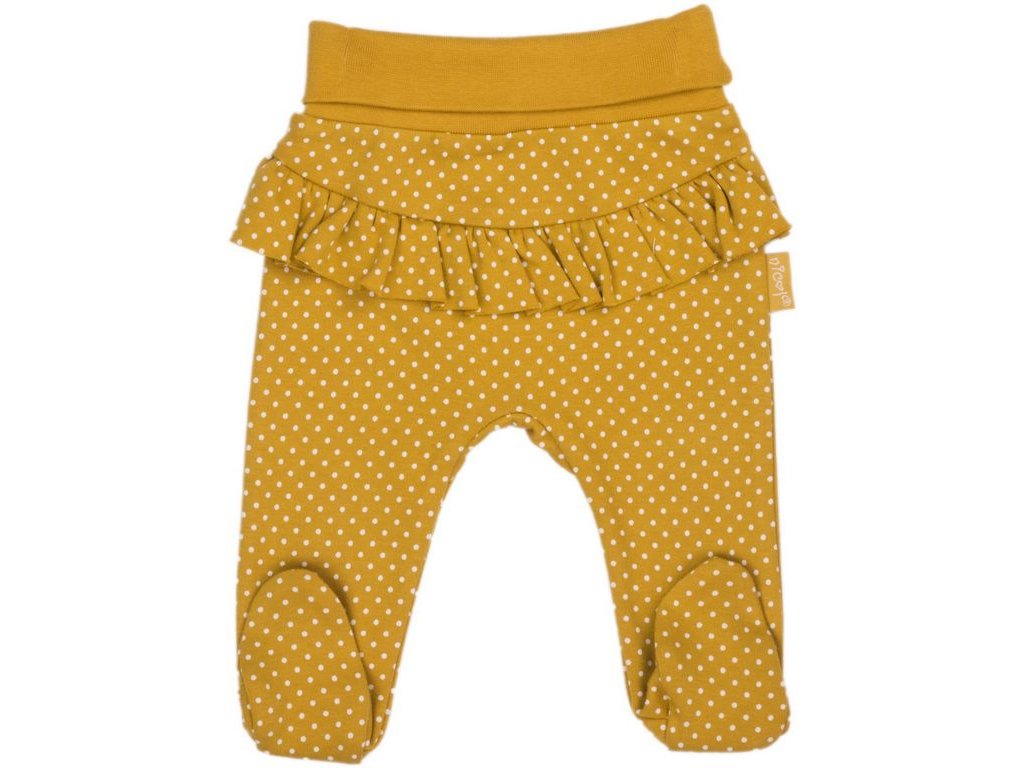 Bodkované poldupačky s volánikom v horčicovej farbe so širokým elastickým pásom,ktorý netlačí .Poldupačky vyrobené z vysokovalitného bavlneného materialu .
