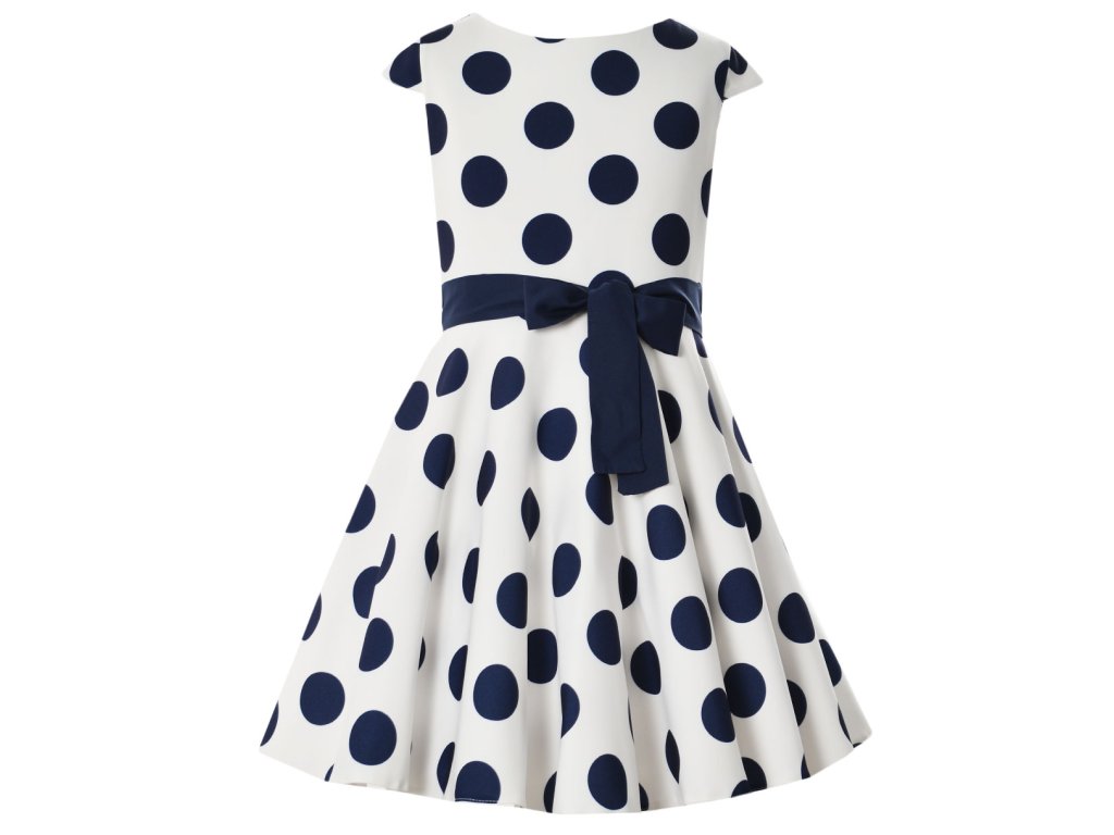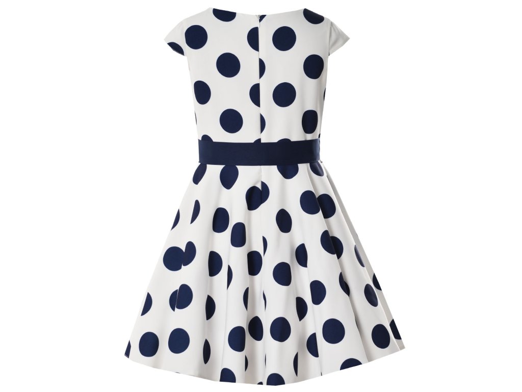 Elegantné dievčenské šaty z kvalitného materiálu typu Barbie v bielej farbe s tmavomodrými bodkami. Bavlnená podšívka s tylom, viazanie na mašľu v páse a zapínanie na krytý zips.