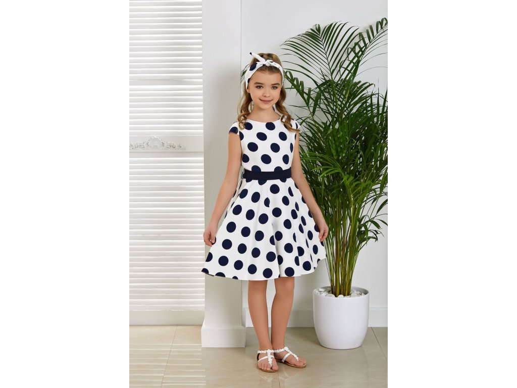 Dievčenské bodkované šaty Marabella – biele s tmavomodrými bodkami M/381