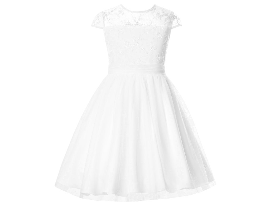 Krásne dievčenské príležitostné šaty ušité z jemnej krajky a saténu. Kruhová sukňa je ušitá z troch vrstiev tylu na satene a bavlnenej podšívke,ukončenej týlovým pásom.V pase previazane týlovým opaskom s viazaním na mašľu. Zapínanie vzadu na gombík a krytý zips .