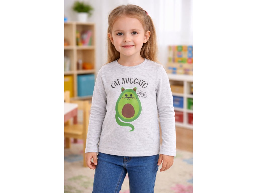Toto dievčenské tričko Cat Avogato je skvelou voľbou pre malé milovníčky veselých motívov. Originálna potlač mačičky v tvare avokáda okamžite zaujme a dodá outfitu hravý detský štýl.