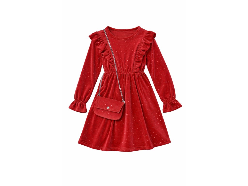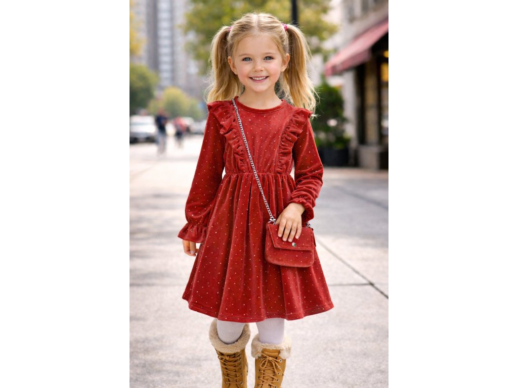 Tieto dievčenské velúrové šaty v červenej farbe sú ideálnou voľbou pre slečny vo veku 13–14 rokov (veľkosť 158), ktoré chcú vyzerať elegantne a cítiť sa pohodlne zároveň. Vyrobené sú z príjemného, mäkkého velúru so jemným bodkovaným vzorom, ktorý pôsobí slávnostne a nadčasovo.