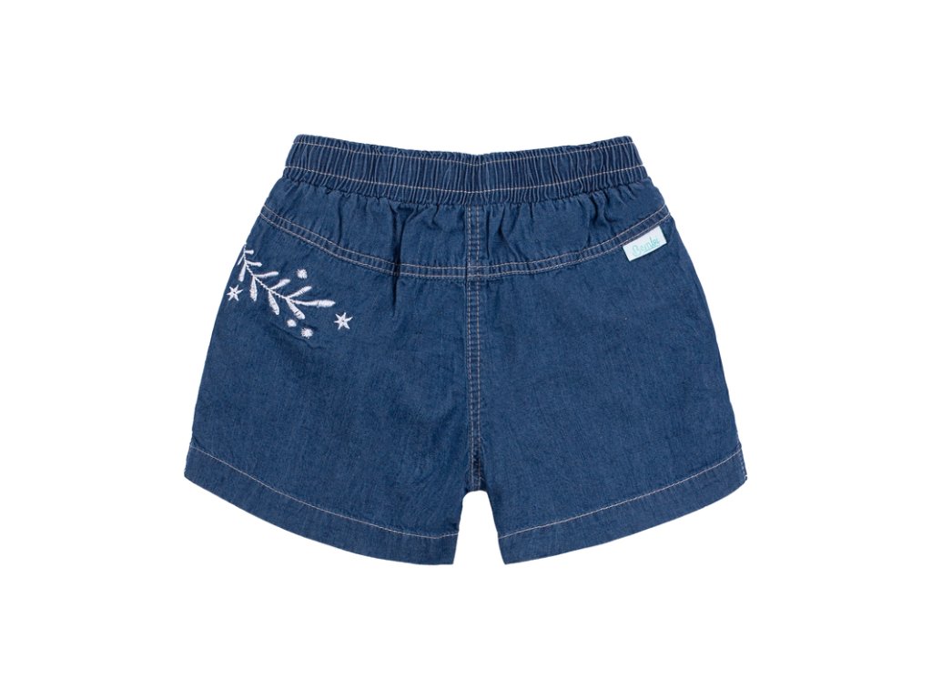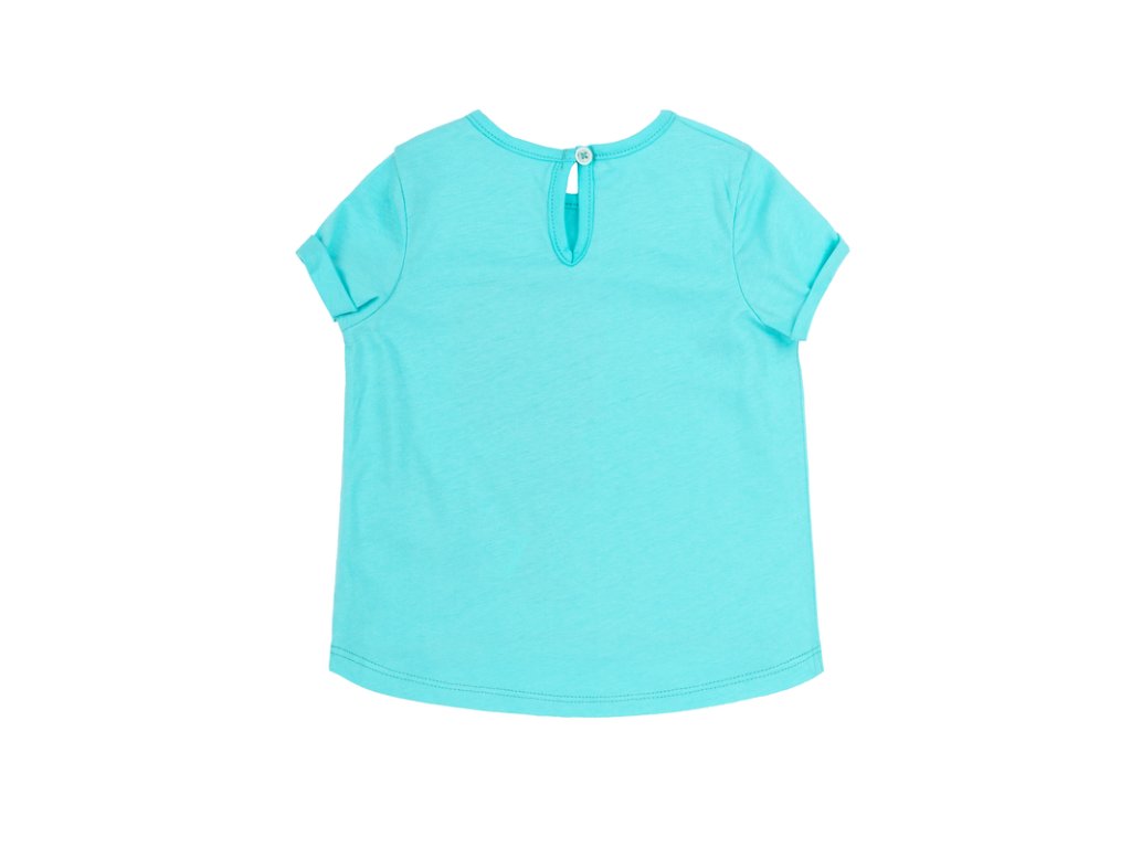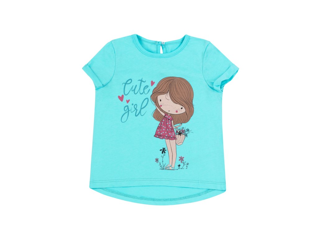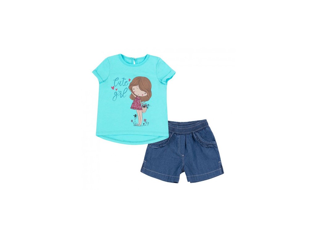 Krásny letný komplet pozostavajúci z trička s potlačou a jeansových kraťaskov.Tričko s krátkym rukávom s manžetou,zapínanie vzadu na gombík , rifľové kraťasy sú ušité z mäkkučkého materialu ,vrecka zdobené volánikom,vzadu jemná výšivka.