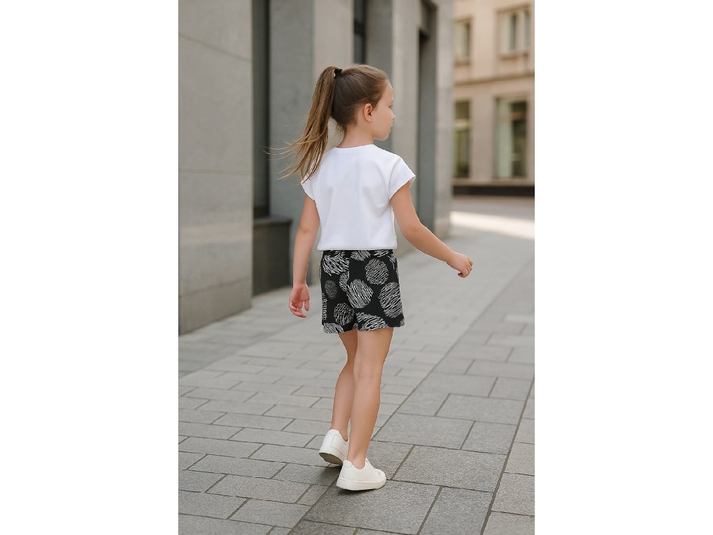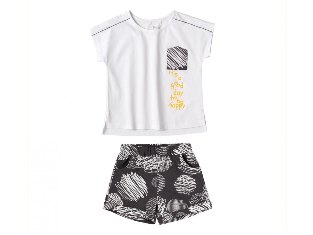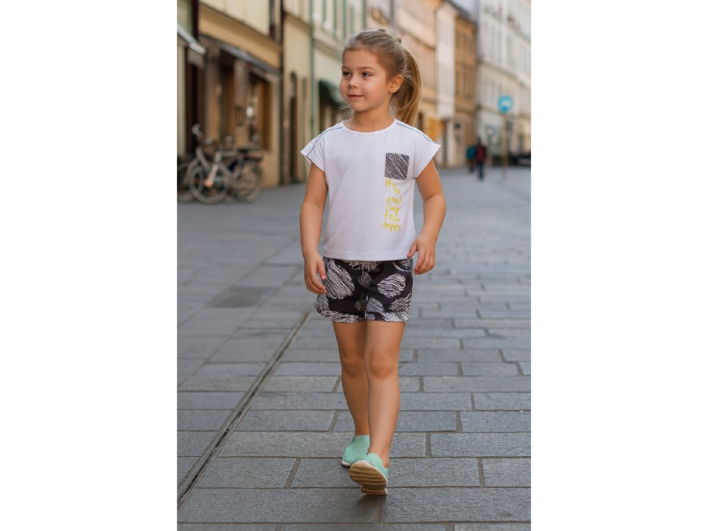 Moderný letný komplet pre malé slečny, ktoré milujú pohodlie aj štýl! Biele tričko s vreckom a veselým žltým nápisom „It's a good day to be happy“ dopĺňajú sivo-biele vzorované kraťasy s elastickým pásom. Ideálny outfit na prechádzky v meste, výlety aj každodenné nosenie.