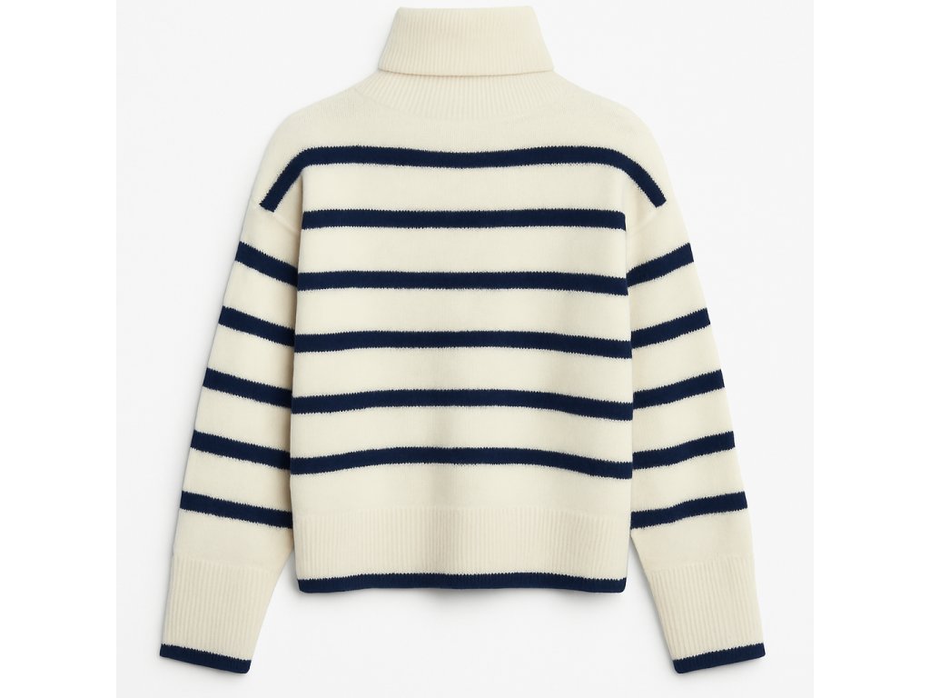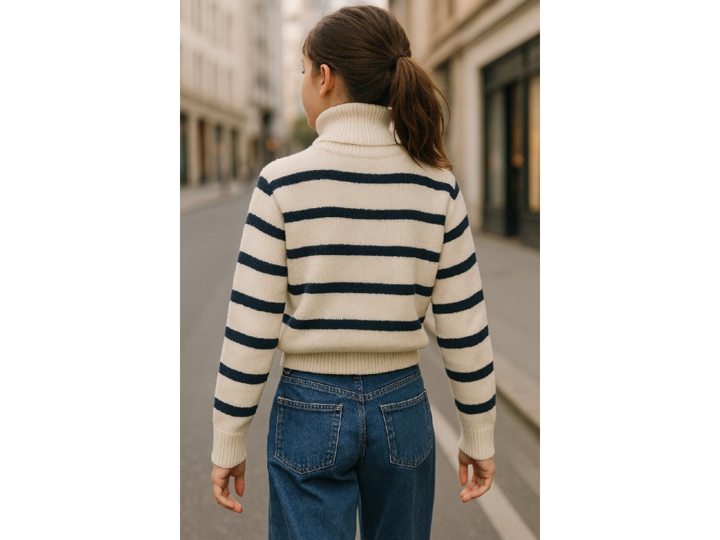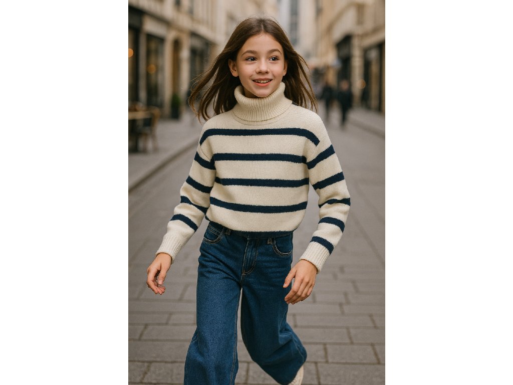 Štýlový dievčenský rolákový sveter v ecru farbe s tmavomodrými pruhmi. Pohodlný, hrejivý a ideálny na bežné nosenie aj do školy. Dostupný vo veľkostiach 4–14 rokov.