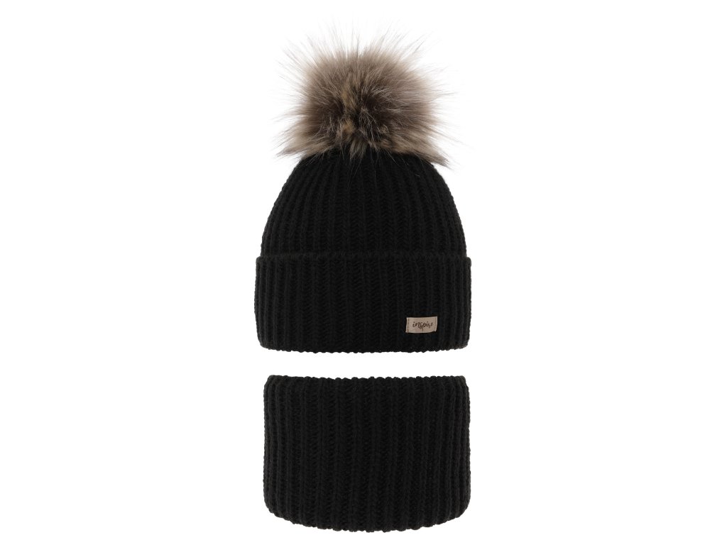 Dievčenský zimný set čiapka a nákrčník s brmbolcom – čierny Willow