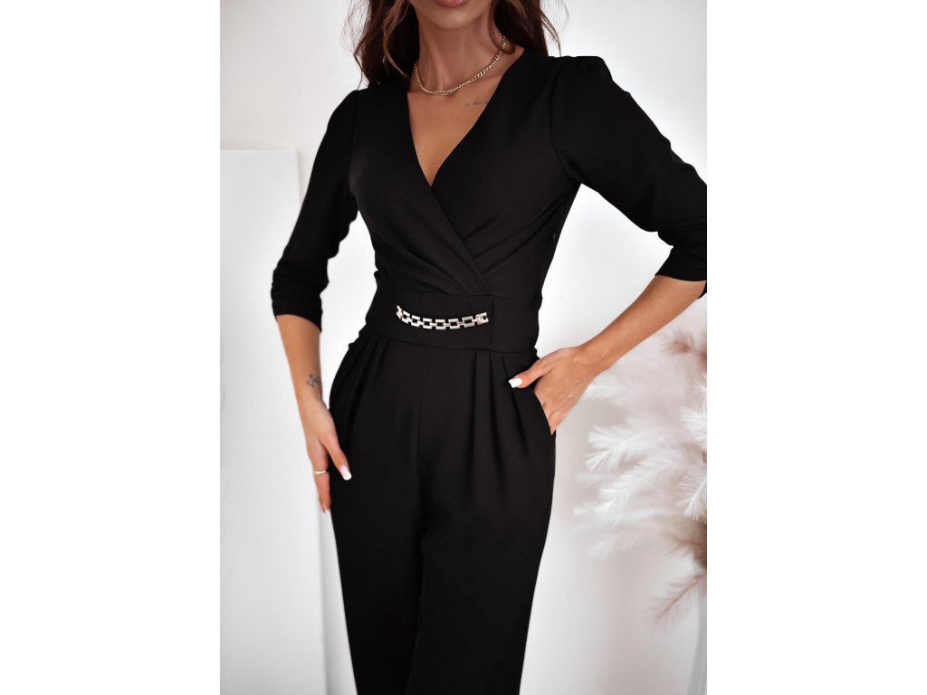 Výnimočná elegancia v modernom prevedení – tento čierny overal je ideálnou alternatívou k spoločenským šatám. Prekrížený živôtik lichotí postave a pridáva sofistikovaný nádych, zatiaľ čo zvýraznený pás so zaujímavým detailom opticky zoštíhľuje.