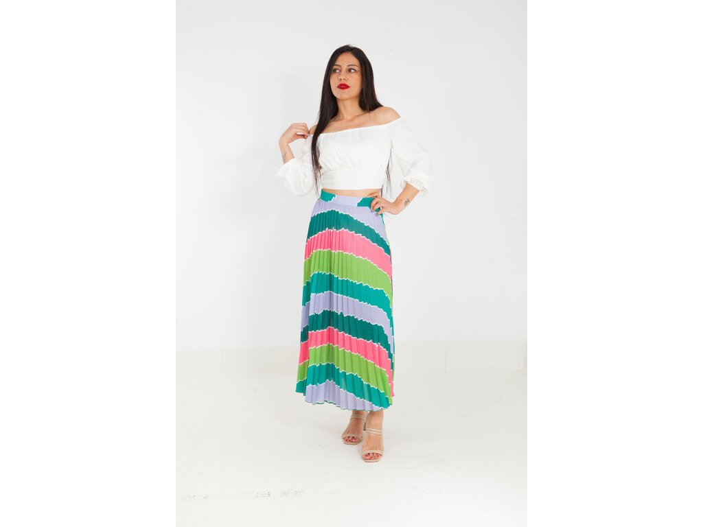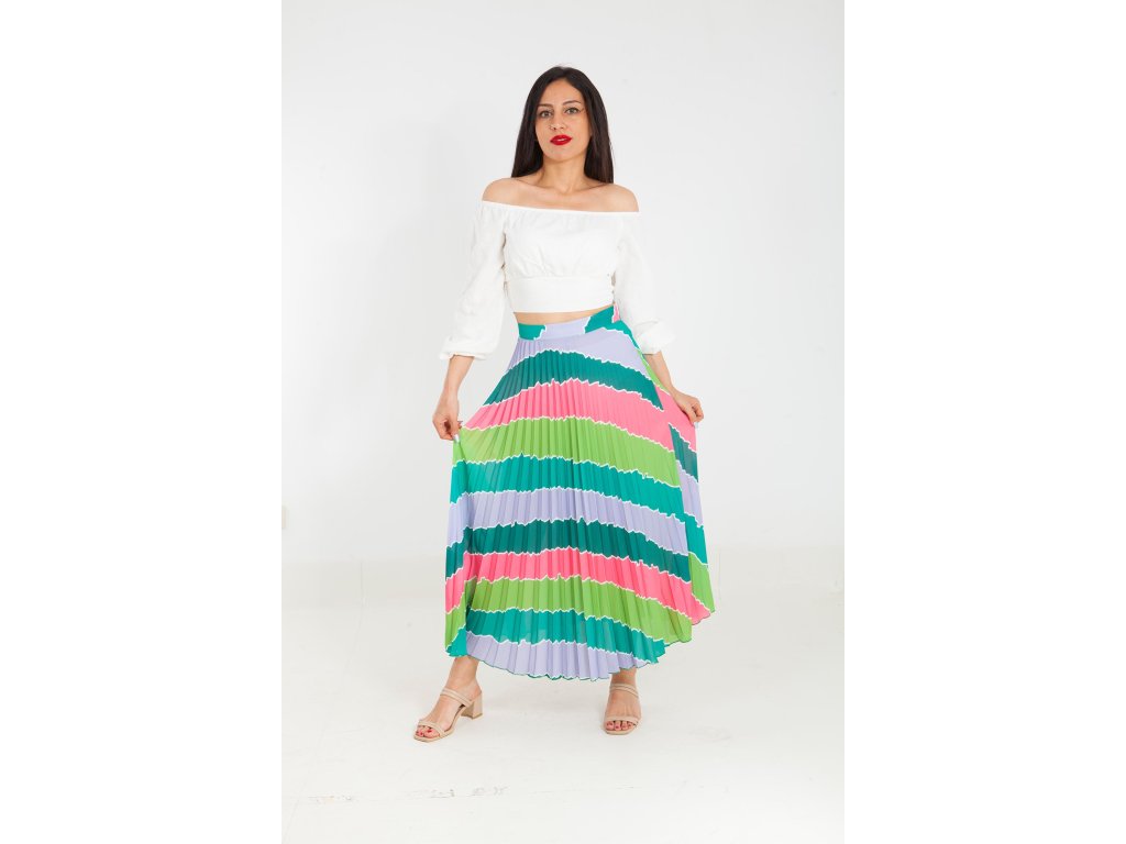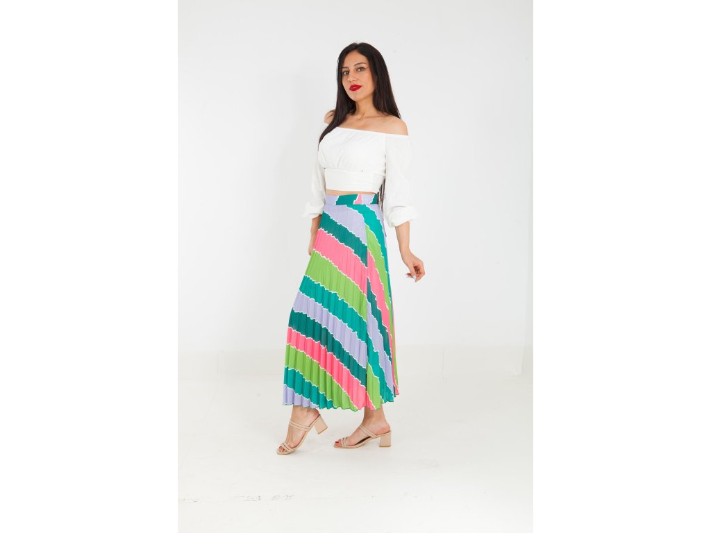 Táto výrazná plisovaná sukňa zaujme farebným pruhovaným vzorom, ktorý oživí každý outfit. Ľahký materiál a elastický pás zabezpečia pohodlné nosenie a voľnosť pohybu. Skvelo sa kombinuje s jednoduchými topmi, blúzkami aj crop topmi — ideálna voľba na letné dni, dovolenku alebo štýlové mestské prechádzky.