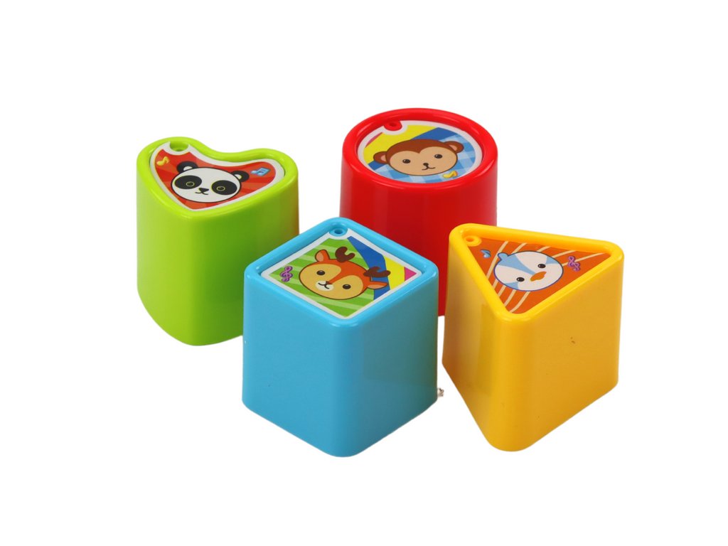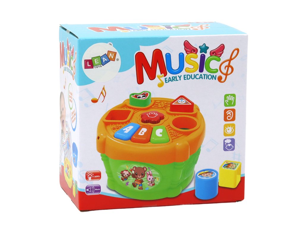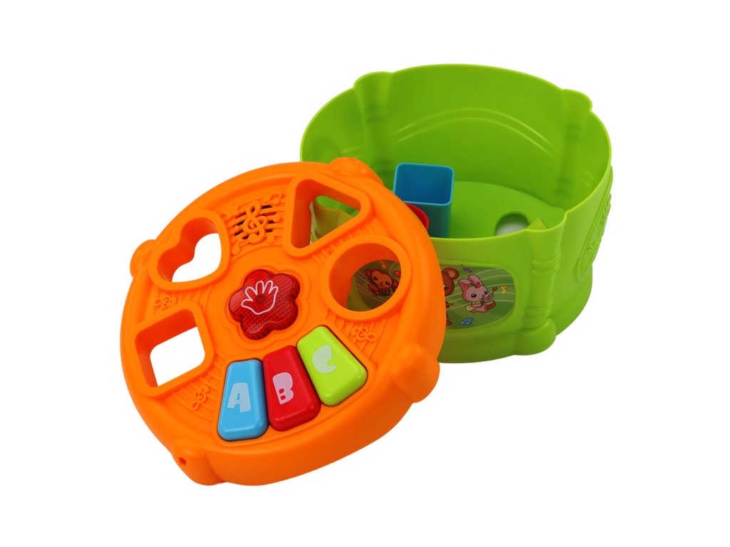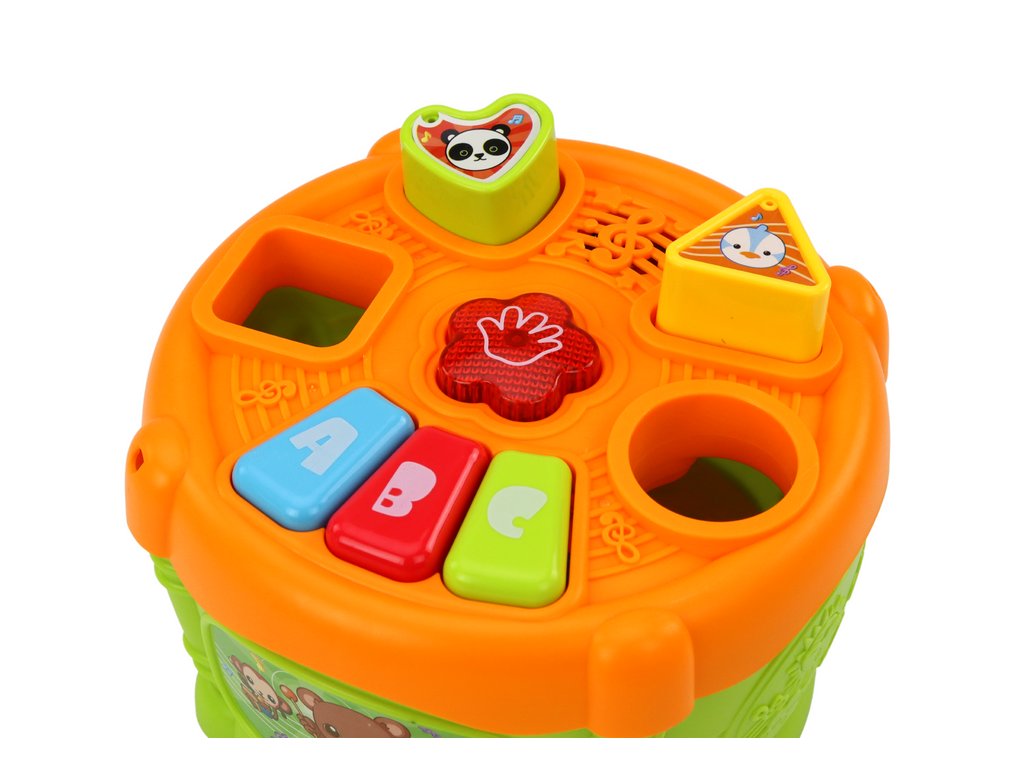 Na vrchnej časti bubienka sa nachádzajú otvory na vkladanie tvarov, ktoré umožňujú dieťaťu trénovať rozpoznávanie tvarov, farieb a presnosť pohybov. Po správnom vložení tvaru sa aktivujú zvuky alebo efekty, vďaka čomu sa dieťa učí príčinným vzťahom a je motivované pokračovať v hre.