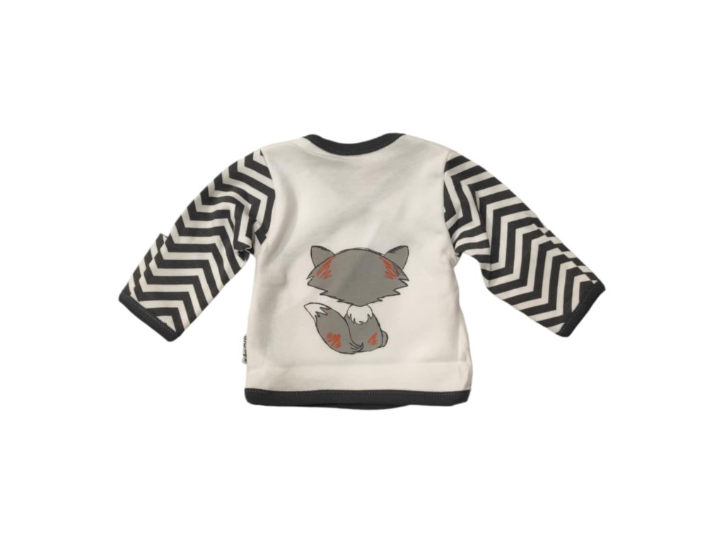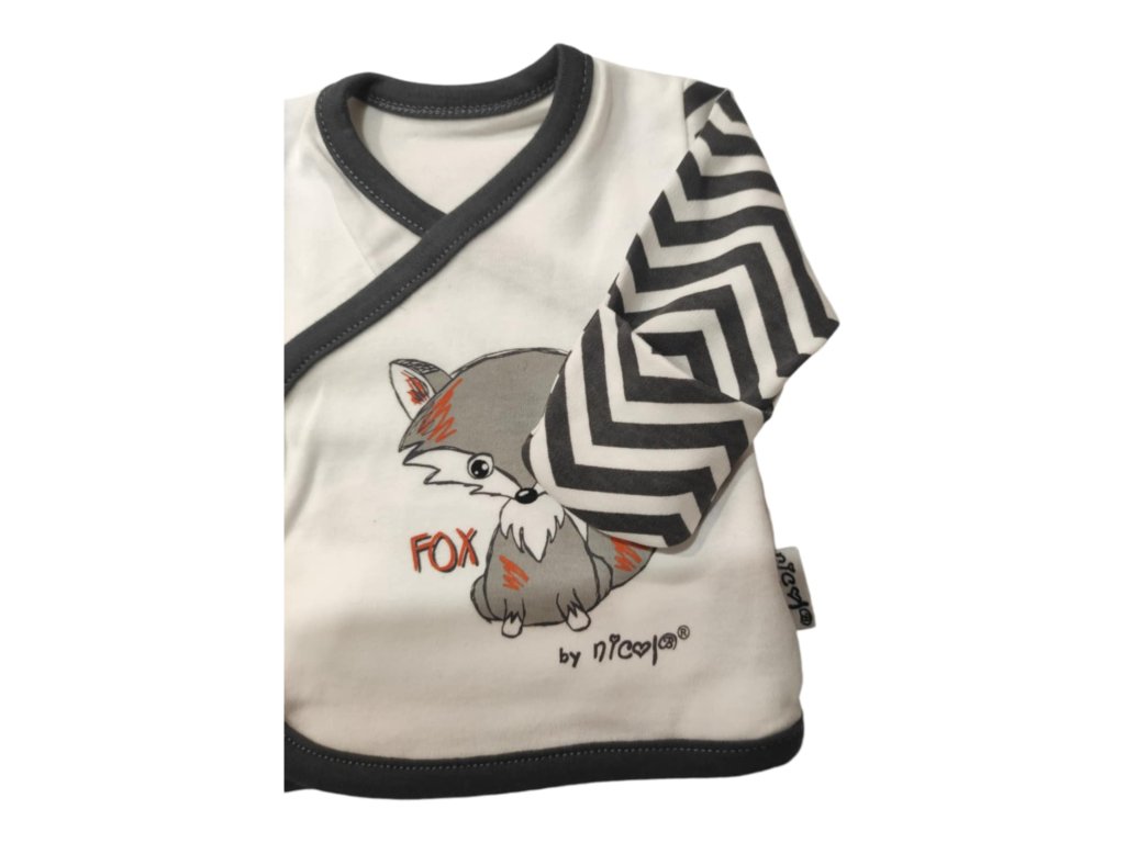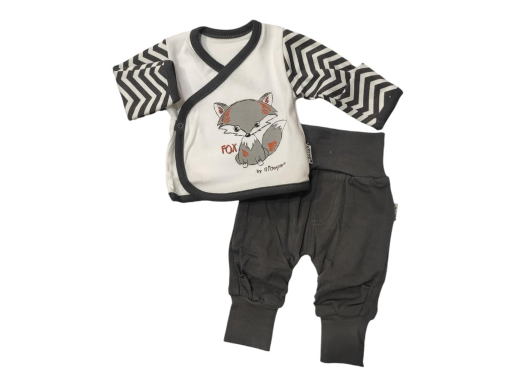 Kabátik má praktické prekladané zapínanie, ktoré uľahčuje obliekanie bez zbytočného preťahovania cez hlavičku. Mäkký materiál je šetrný k citlivej pokožke dieťaťa a zabezpečuje maximálne pohodlie počas celého dňa. Hravý motív líšky dodáva kompletu jemný a roztomilý vzhľad.