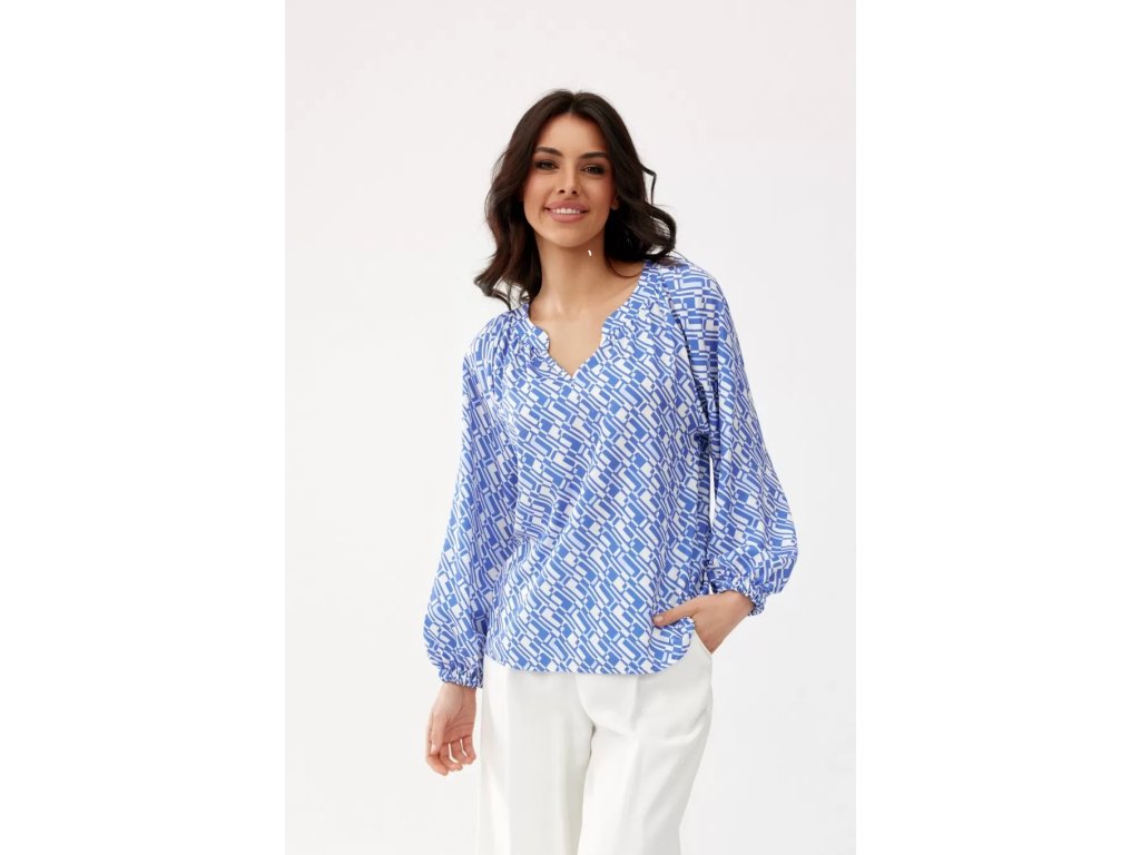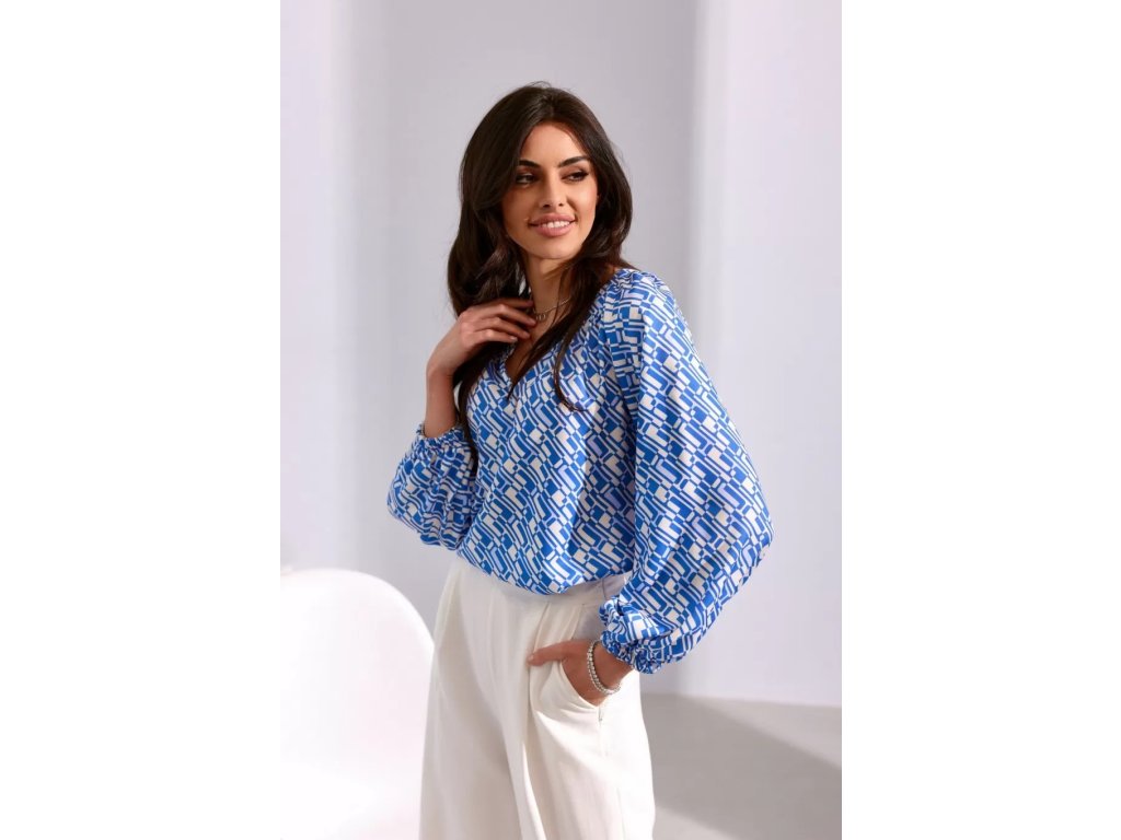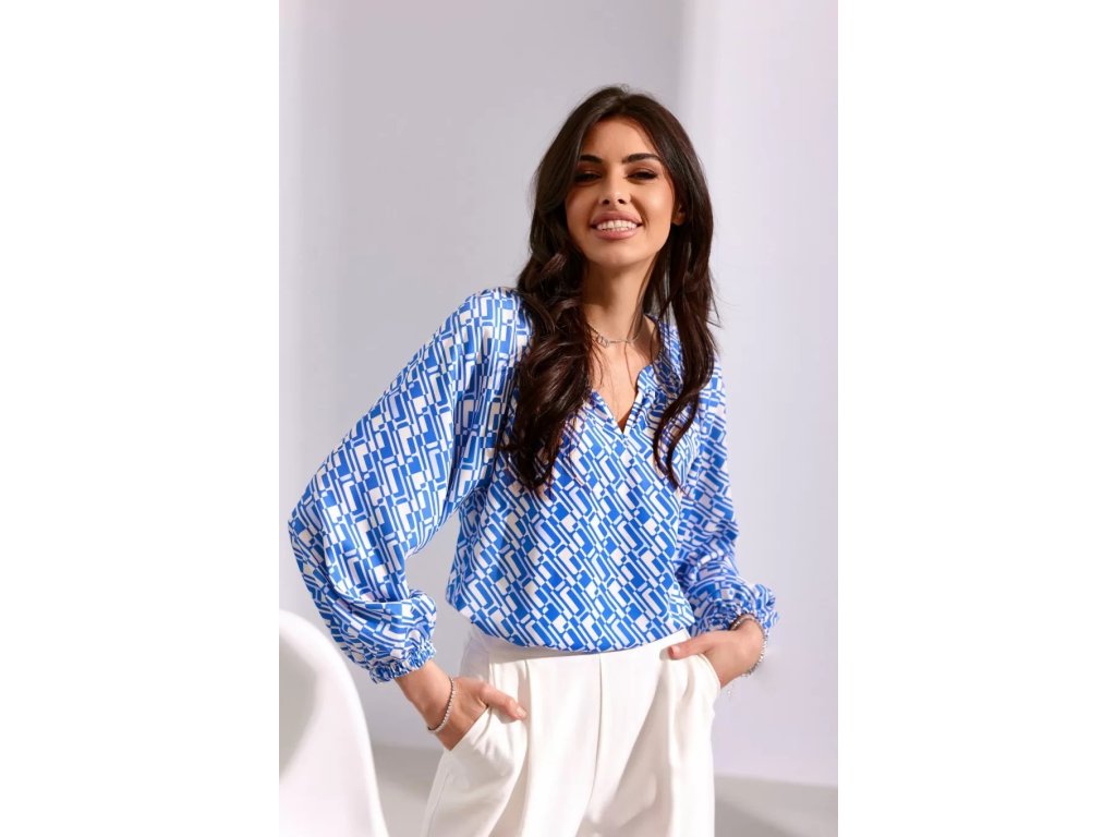Táto elegantná dámska blúzka s výrazným modro-bielym geometrickým vzorom je skvelou voľbou pre ženy, ktoré chcú spojiť štýl a pohodlie. Voľný strih s dlhými rukávmi a mierne elastickými manžetami zaručuje príjemné nosenie. Blúzka je ľahko kombinovateľná so spoločenskými nohavicami aj džínsami, vhodná na bežný deň aj pracovné stretnutia. Univerzálna veľkosť UNI sa prispôsobí rôznym postavám.