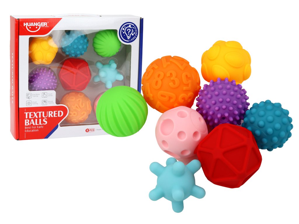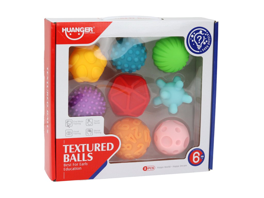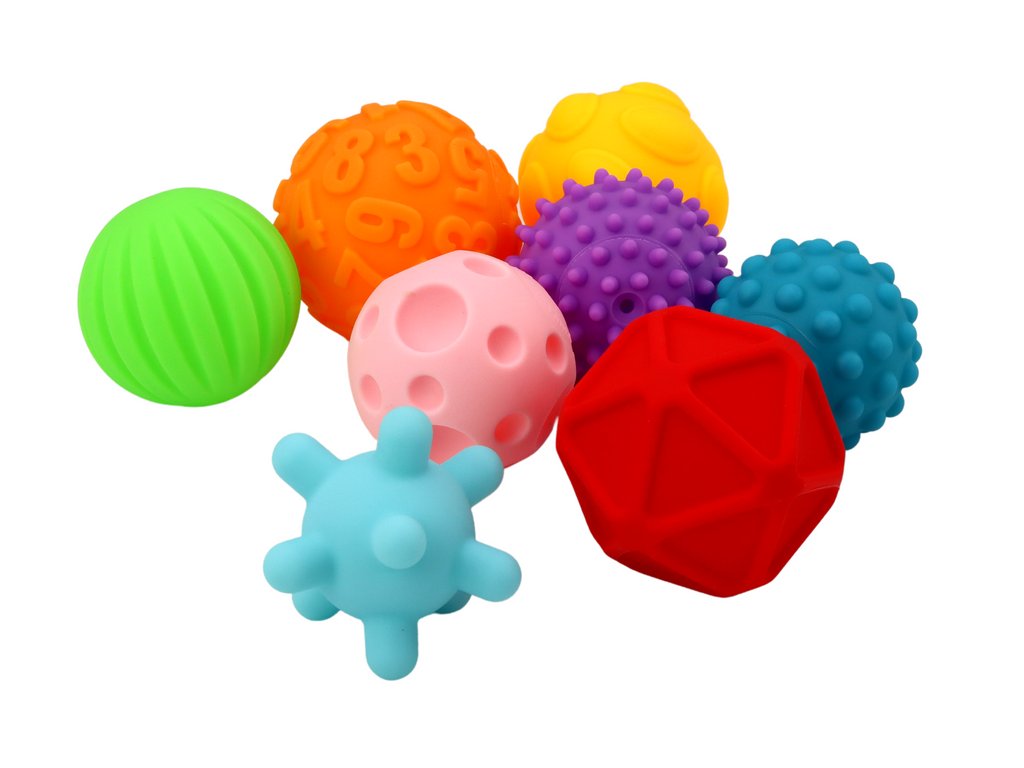 Každá loptička má inú štruktúru – hladkú, bodkovanú, ryhovanú, jemne pichľavú či reliéfnú. Dieťa tak môže porovnávať rozdiely medzi povrchmi a rozvíjať hmatové vnímanie. Pri stlačení loptičky vydajú jemný zvuk, ktorý podporuje aj rozvoj sluchu a povzbudzuje bábätko k ďalšej manipulácii.