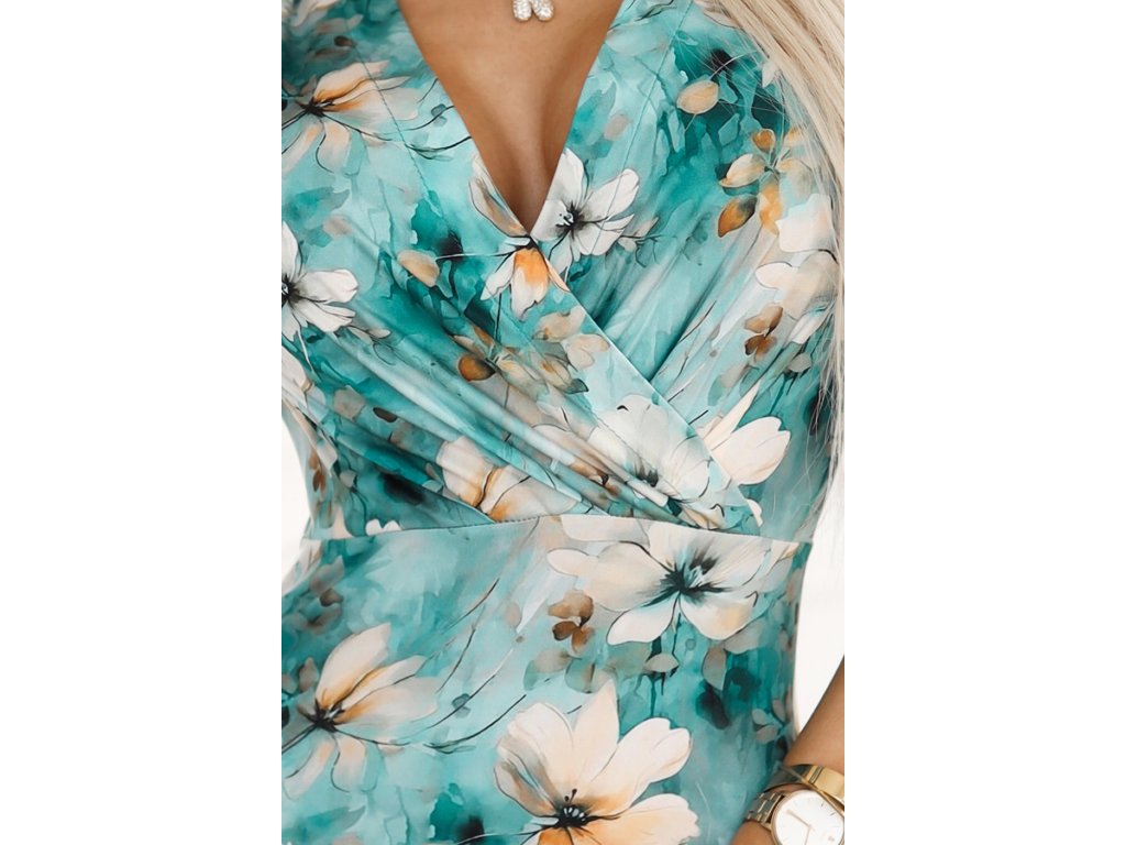 Tyrkysové kvetované puzdrové šaty s výstrihom –