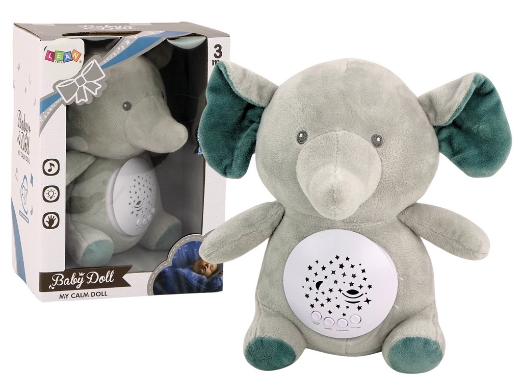 Vo svojom brušku ukrýva projektor hviezd, ktorý premieta na stenu alebo strop krásnu hviezdnu nočnú oblohu. Jemné svetielka lákajú pozornosť dieťaťa a navodzujú pocit bezpečia. Spolu s tým sloník prehráva kołysanky a upokojujúce zvuky, ktoré pomáhajú navodiť pokojný spánok.